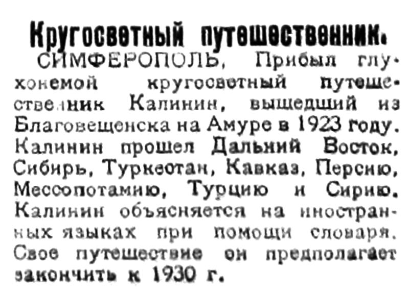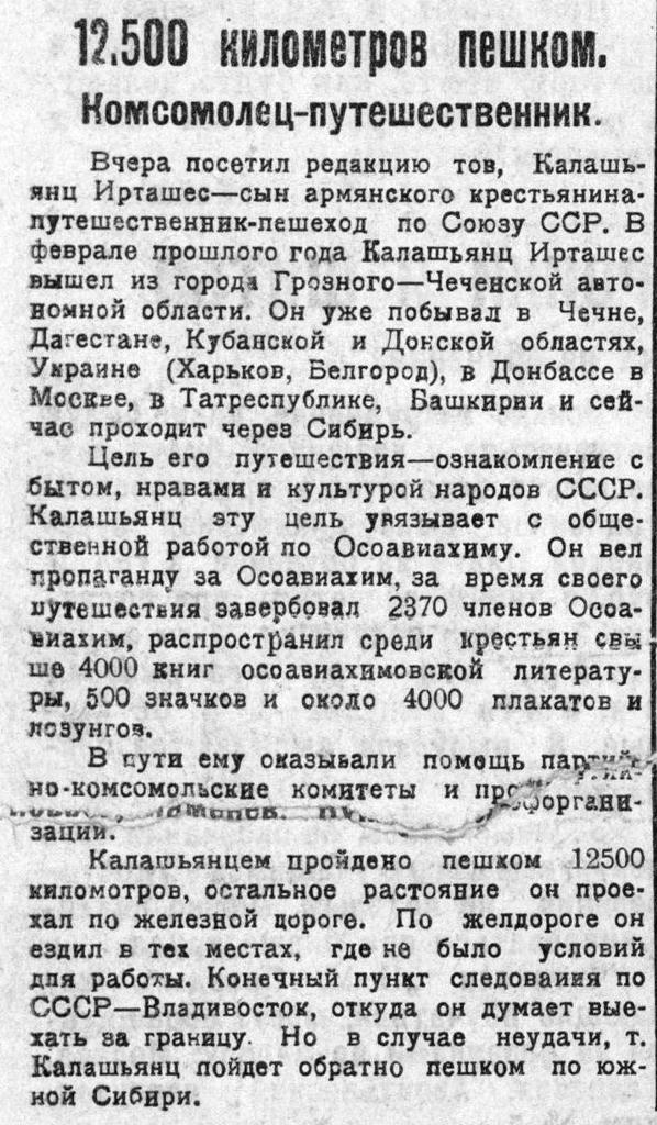 31 августа в Новониколаевск прибыл пешеход Сенин, совершающий переход Ташкент - Владивосток. Сенин является физкультурником ташкентской организации. Старт ему был дан на стадионе в Ташкенте 5 июня с. г.