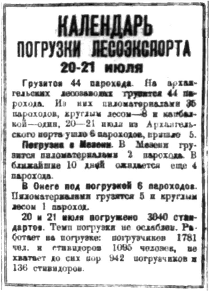 20 и 21 июля погружено 3040 стандартов. Темп погрузки не ослаблен. Работает на погрузке погрузчиков 1781 чел. и стивидоров 1095 человек, не хватает до сих пор 942 погрузчиков и 136 стивидоров.