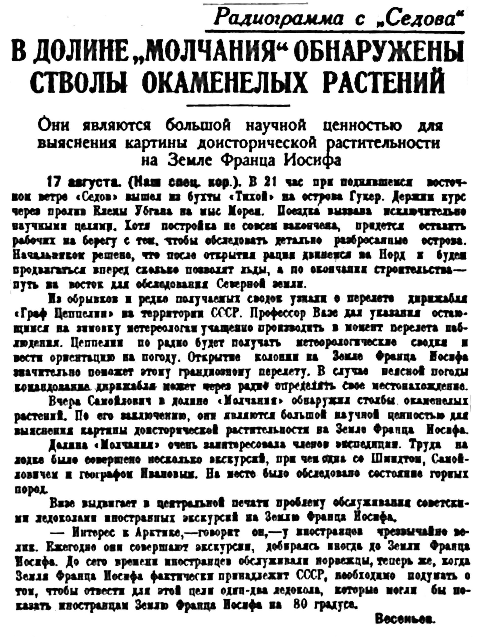 Из обрывков и редко получаемых сводок узнали о перелете дирижабля "Граф Цеппелин" на территории СССР. Профессор Визе дал указания остающимся на зимовку метеорологам учащенно производить в момент перелета наблюдения . Цеппелин по радио будет получать метеорологические сводки и вести ориентацию на погоду. Открытие колонии на Земле Франца Иосифа значительно поможет этому грандиозному перелету. В случае неясной погоды командование дирижабля может через радио определять свое местонахождение.