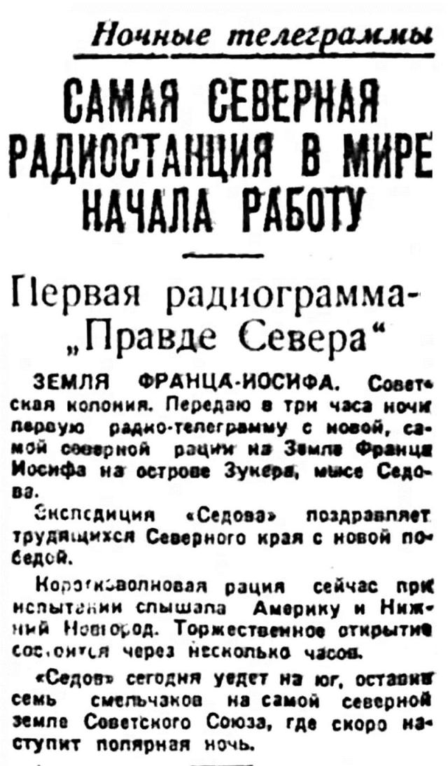 ЗЕМЛЯ ФРАНЦА-ИОСИФА. Советская колония. Передаю в три часа ночи первую радио-телеграмму с новой, самой северной рации на Земле Франца Иосифа на острове Г[З]укера, мыса Седова.