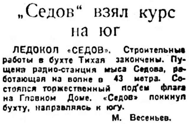 ЛЕДОКОЛ «СЕДОВ». Строительные работы в бухте Тихая закончены. Пущена радио-станция мыса Седова, работающая на волне о 43 метра. Состоялся торжественный подъем флага на Главном Доме. «Седов» покинул бухту, направляясь к югу.