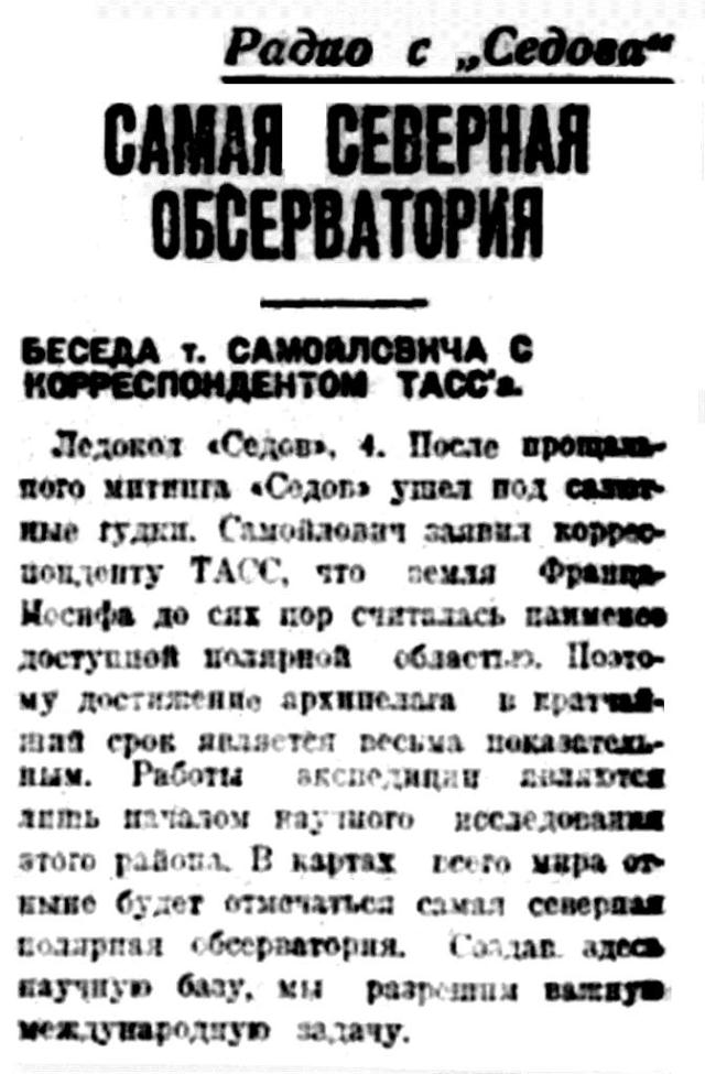Ледокол «Седов». 4. После прощального митинга «Седов» ушел под салютные гудки. Самойлович заявил корреспонденту ТАСС, что земля Франца-Иосифа до сих пор считались наименее доступной полярной областью. Поэтому достижение архипелага в кратчайший срок является весьма показательным. Работы экспедиции являются лишь началом научного исследования этого района. В картах всего мира отныне будет отмечаться самая северная полярная обсерватория. Создав здесь научную базу, мы разрешим важную международную задачу.