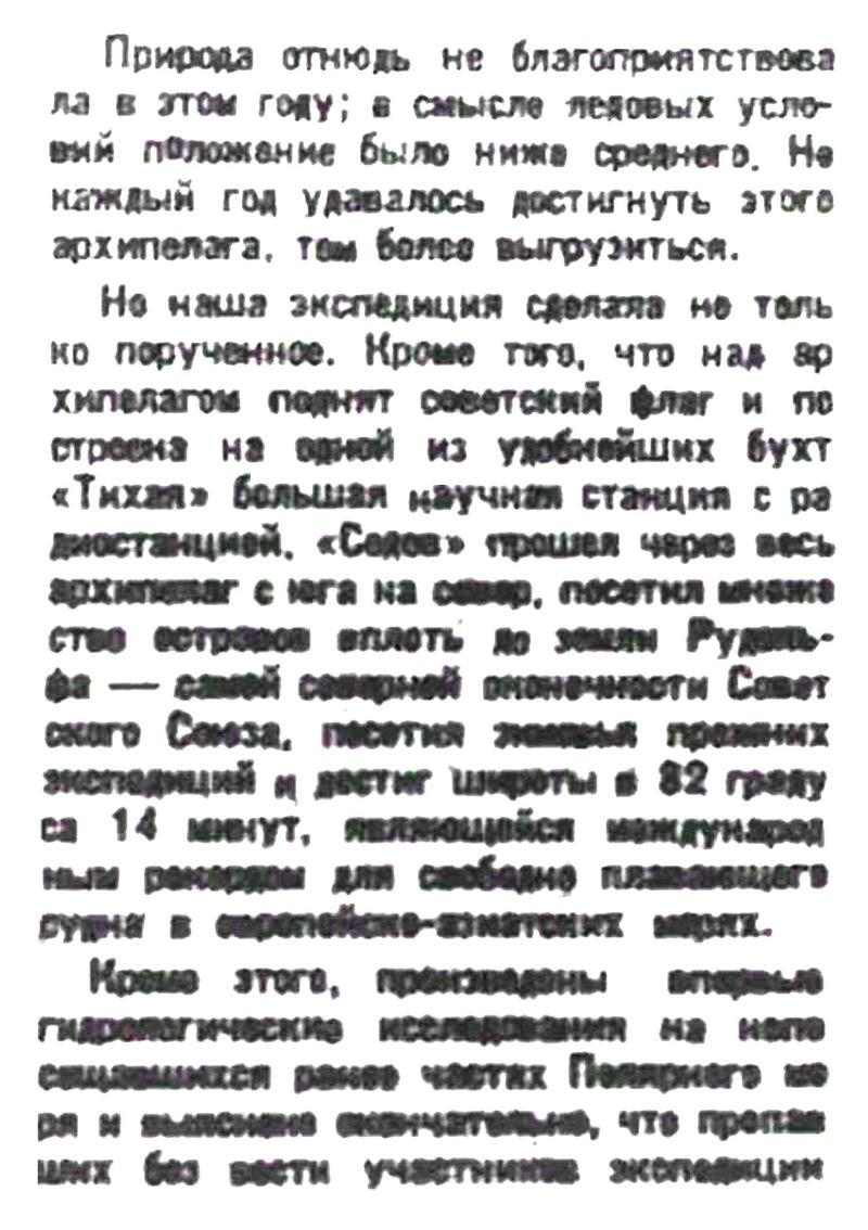 Но наша экспедиция сделала не только порученное. Кроме того, что над архипелагом поднят советский флаг и построена на одной из удобнейших бухт «Тихая» большая научная станция с радиостанцией. «Седов» прошел через весь архипелаг с юга на север, посетил множество островов вплоть до земли Рудольфа - самой северной оконечности Советского Союза, посетил зимовья прежних экспедиций и достиг широты в 82 градуса 14 минут, являющейся международным рекордом для свободно плавающего судна в европейско-азиатских морях.