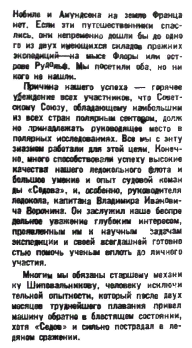 Причина нашего успеха — горячее убеждение всех участников, что Советскому Союзу, обладающему наибольшим из всех стран полярным сектором, должно принадлежать руководящее место в полярных последованиях. Все мы с энтузиазмом работали для этой цели. Конечно, много способствовали успеху высокие качества нашего ледокольного флота и большое умение и опыт судовой команды «Седова», и, особенно, руководителя ледокола, капитана Владимира Ивановича Воронина. Он заслужил наше беспредельное уважение глубоким интересом, проявленным им к научным задачам экспедиции и своей всегдашней готовностью помочь ученым вплоть до личного участия.