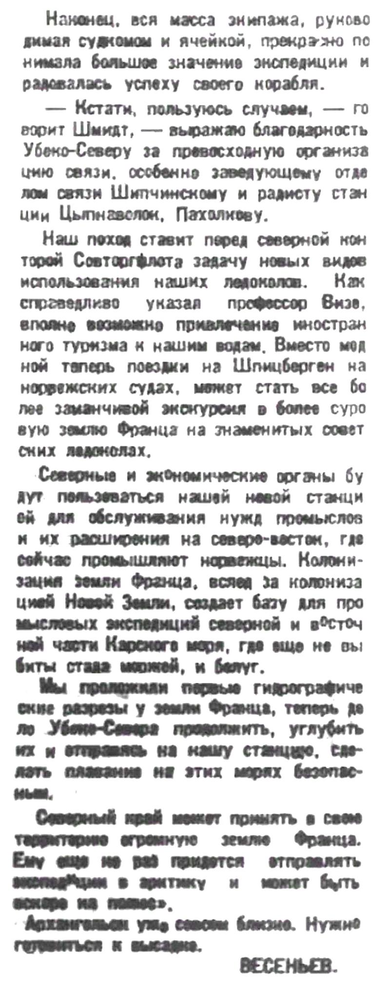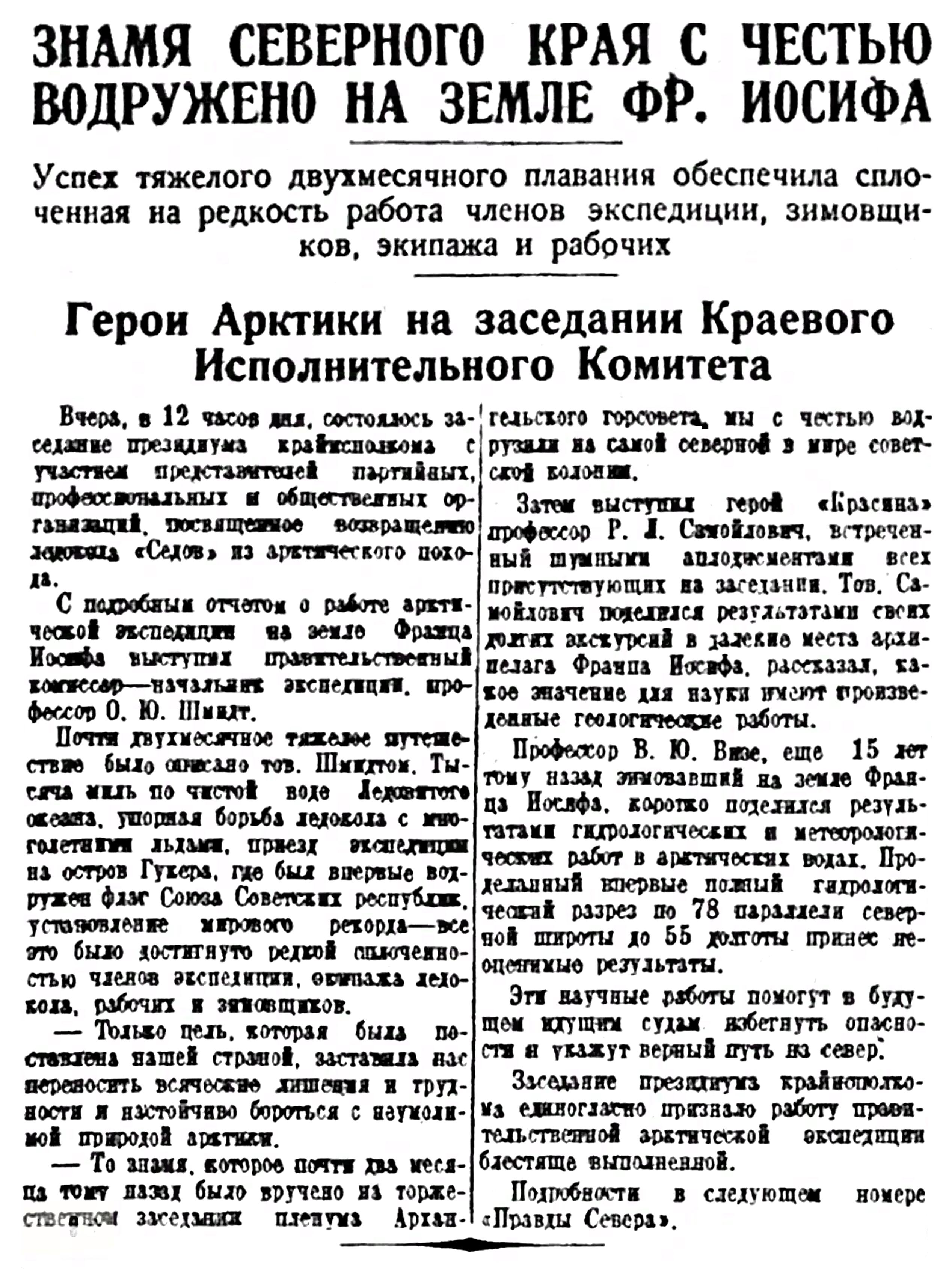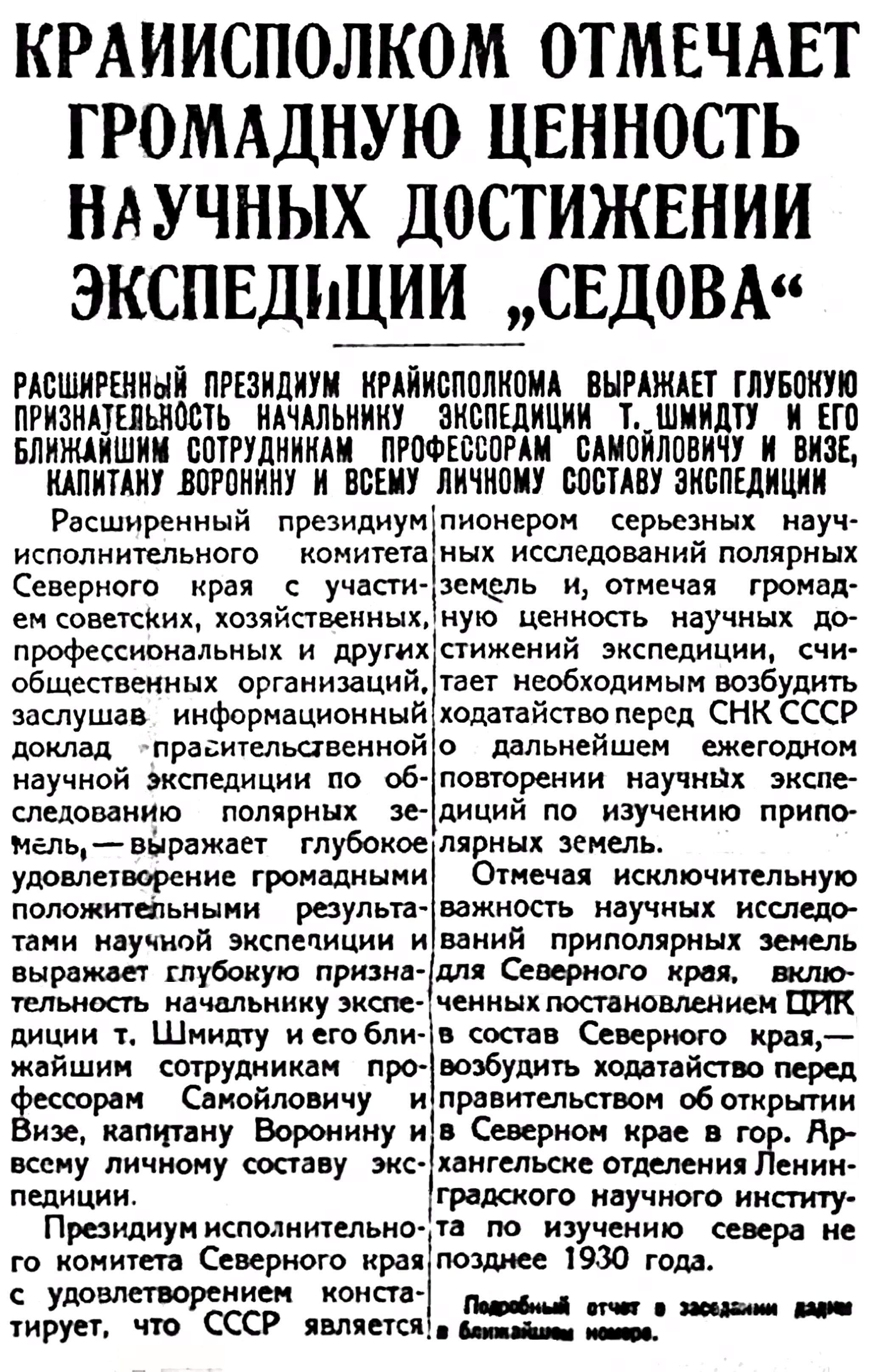 Расширенный президиум исполнительного комитета Северного края с участием советских, хозяйственных, профессиональных и других общественных организаций, заслушав информационный доклад правительственной научной экспедиции по обследованию полярных земель, — выражает глубокое удовлетворение громадными положительными результатами научной экспедиции и выражает глубокую признательность начальнику экспедиции т, Шмидту и его ближайшим сотрудникам профессорам Самойловичу и Визе, капитану Воронину и всему личному составу экспедиции.