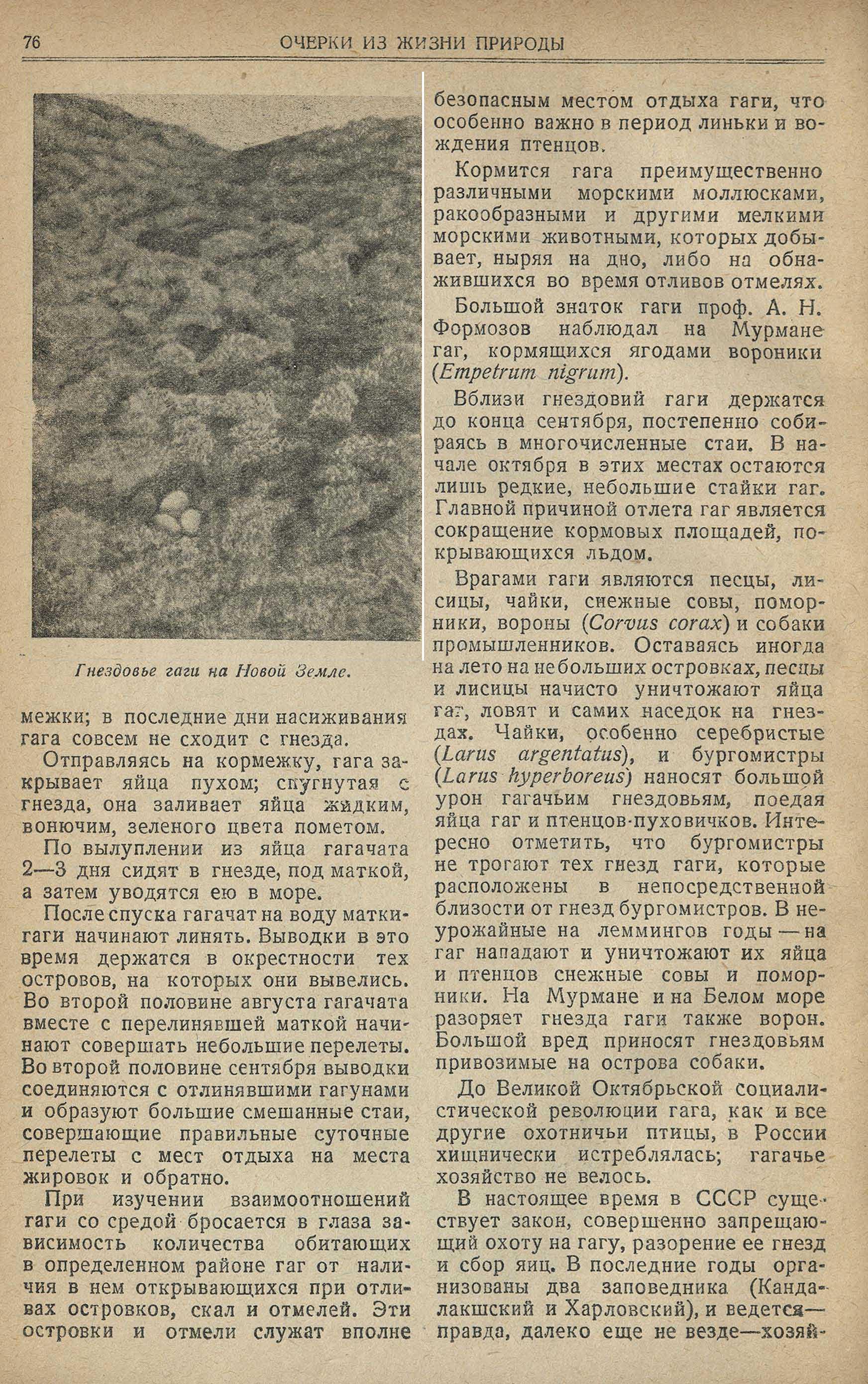 Задолго до появления статьи Беленького мы знали (по работам Мензбира, Данилевского, Формозова и др. ), что гага распространена по побережью наших северных морей, что она дает ценный пух, что ее необходимо охранять и т. д. и т. п., а проф. А. Н. Формозов, сделав краткую хорошую сводку наших знаний о гаге, дал и ряд ценных предложений на основании личного опыта.