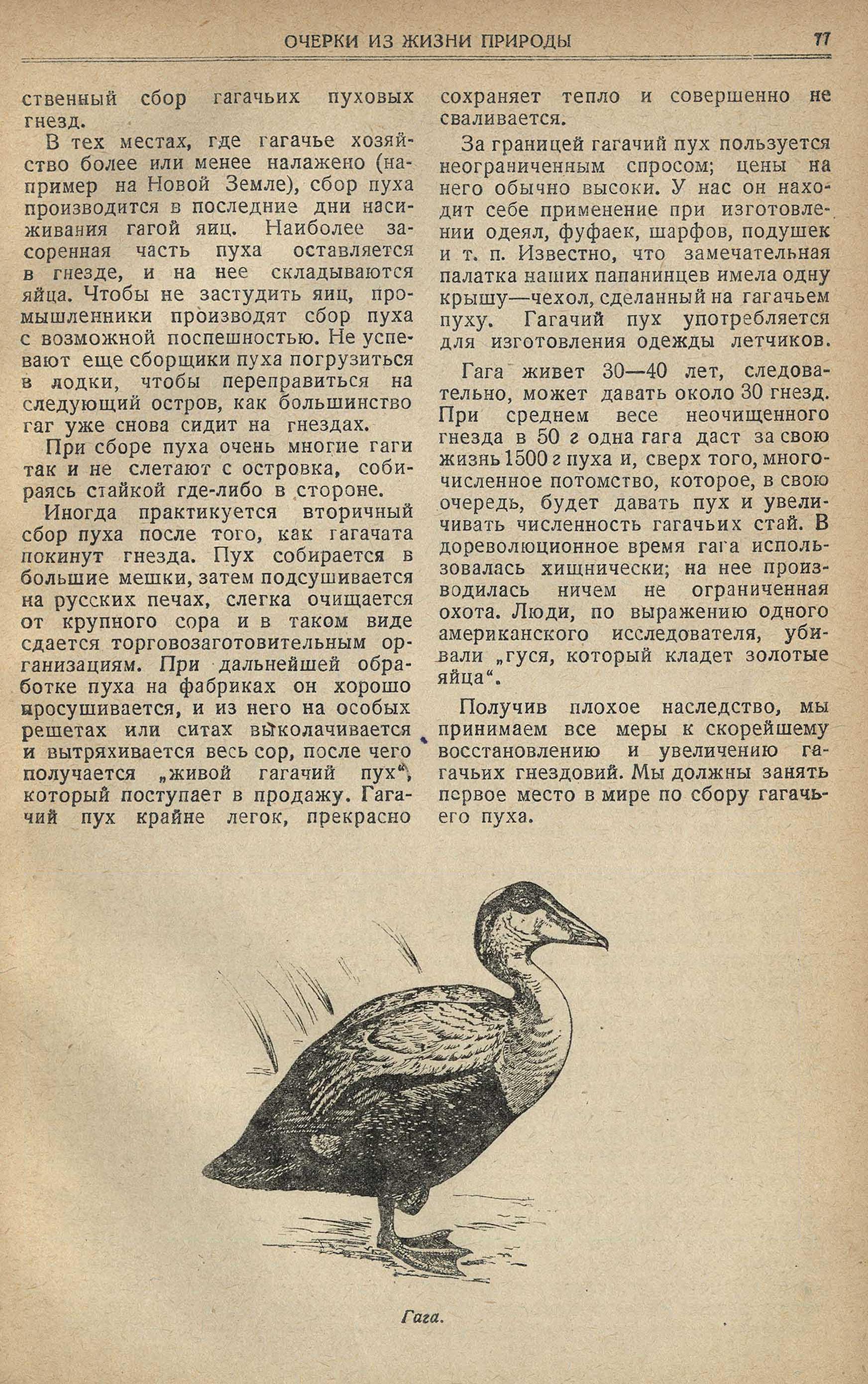 Известно, что в Норвегии и Исландии уже около трех столетий ведут пуховое гагачье хозяйство, известно, что почти каждый зоолог Союза, попадая на Север и наблюдая промысел гаги, поднимал вопрос о ее охране и организации гагачьего хозяйства, известно, что в советское время сделаны важные шаги в этом направлении; однако, несмотря на все это, научный работник Беленький рекомендует в своей статье и, вероятно, рекомендовал на месте работ промышленникам организованно заготавливать гагу — "вымачивать ее в уксусе и собирать ее яйца".