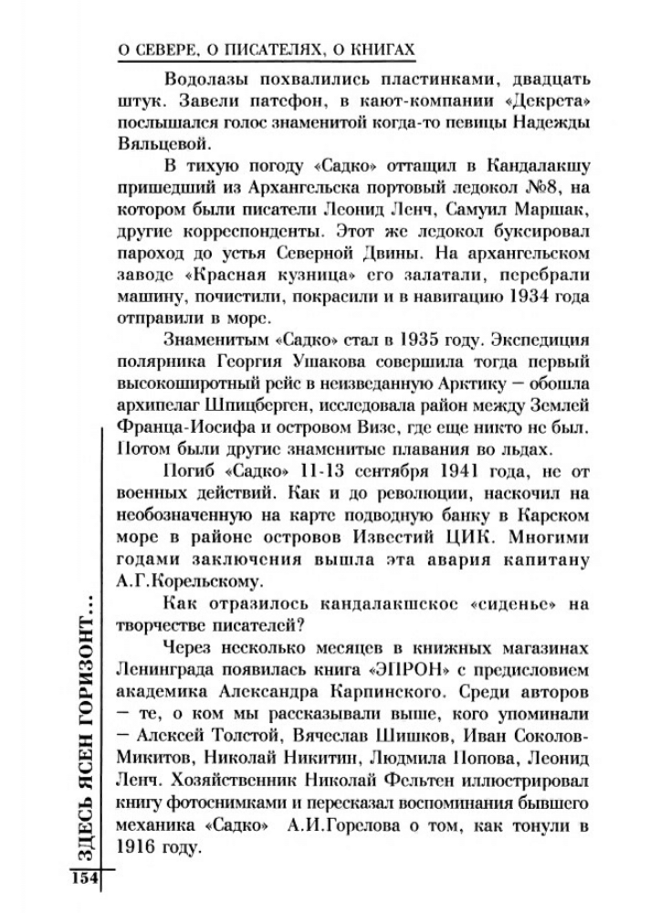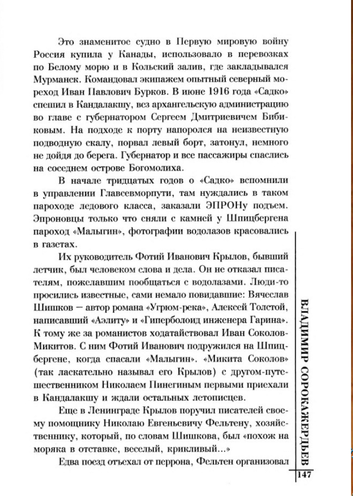 Мы едем вместе на подъём «Садко». Он, Шишков и я. Но ему мало было только этого подъёма. Он изменил весь маршрут, нарушил все планы начальника ЭПРОНа Ф.И. Крылова. Бело-морканал, пристани, шлюзы, капитаны, чекисты, заключённые, консервные фабрики Кандалакши, океанографические станции, совхоз «Имандра», опытные полярные поля, Хибины, апатиты, гор-норабочие, инженеры, старообрядческие деревни на Выге – всё необходимо ему, кроме водолазов и кроме подъёма парохода, затонувшего ещё в годы первой империалистической войны.
