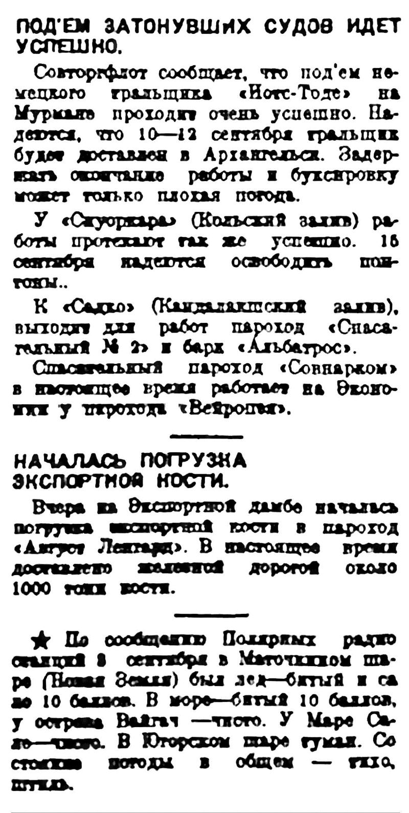 Приводится переброска грузов на склады правого берега, на Смольный Буян, куда вероятно будет заброшено около 100 тысяч пудов. На днях снова ожидается массовое прибытие грузов, о чем Совторгфлот получил телеграфное извещение.