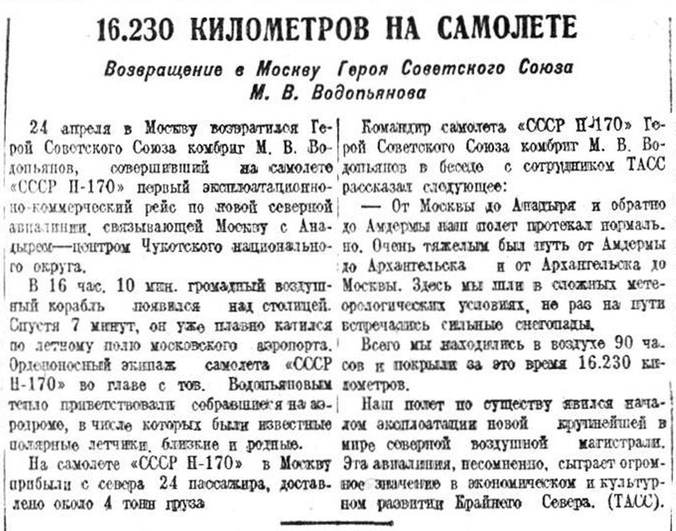 24 апреля в Москву возвратился Герой Советского Союза комбриг М. В. Водопьянов, совершивший на самолете «СССР Н-170» первый эксплоатационно-коммерческий рейс по новой северной авиалинии, связывающей Москву с Анадырем — центром Чукотского национального округа.