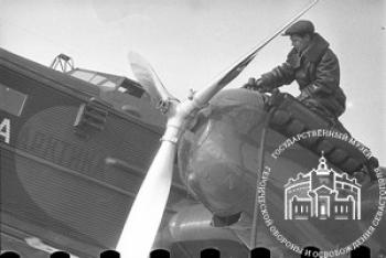 Видимо на фоне своего самолёта в период 22 марта - 25 июня 1937, ВВЭ "Север", флаг-штурман экспедиции комбриг И.Т.Спирин и КК М.В.Водопьянов.