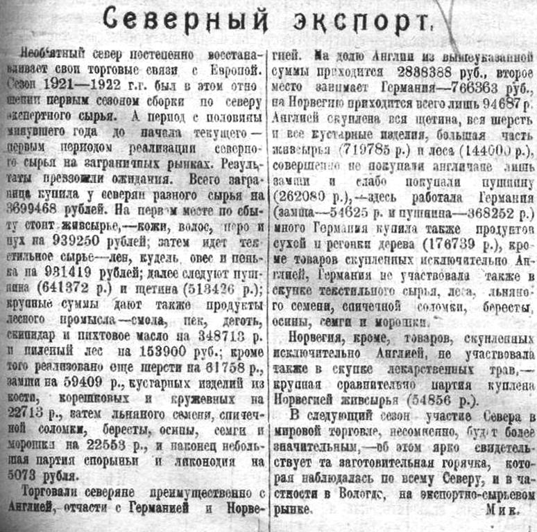 Необъятный север постепенно восстанавливает свои торговые связи с Европой. Сезон 1921—1922 г.г. был в этом отношении первым сезоном сборки по северу экспортного сырья. А период с половины минувшего года до начала текущего — первым периодом реализации северного сырья на заграничных рынках. Результаты превзошли ожидания. Всего заграница купила у северян разного сырья на 3699468 рублей. На первом месте по сбыту стоит живсырье, — кожи, волос, перо и пух на 939250 рублей; затем идет текстильное сырье - лен, кудель, овес и пенька на 931419 рублей; далее следуют пушнина (641372 р.) и щетина (513426 р.); крупные суммы дают также продукты лесного промысла — смола, пек, деготь, скипидар и пихтовое масло на 348713 р. и пиленый лес на 153900 руб.; кроме того реализовано еще шерсти на 61758 р., замши на 59409 р., кустарных изделий из кости, корешковых и кружевных на 22713 р., затем льняного семени, спичечной соломки, бересты, осины, семги и морошки на 22563 р., и наконец небольшая партия спорыньи и ликоподия на 5073 рубля.