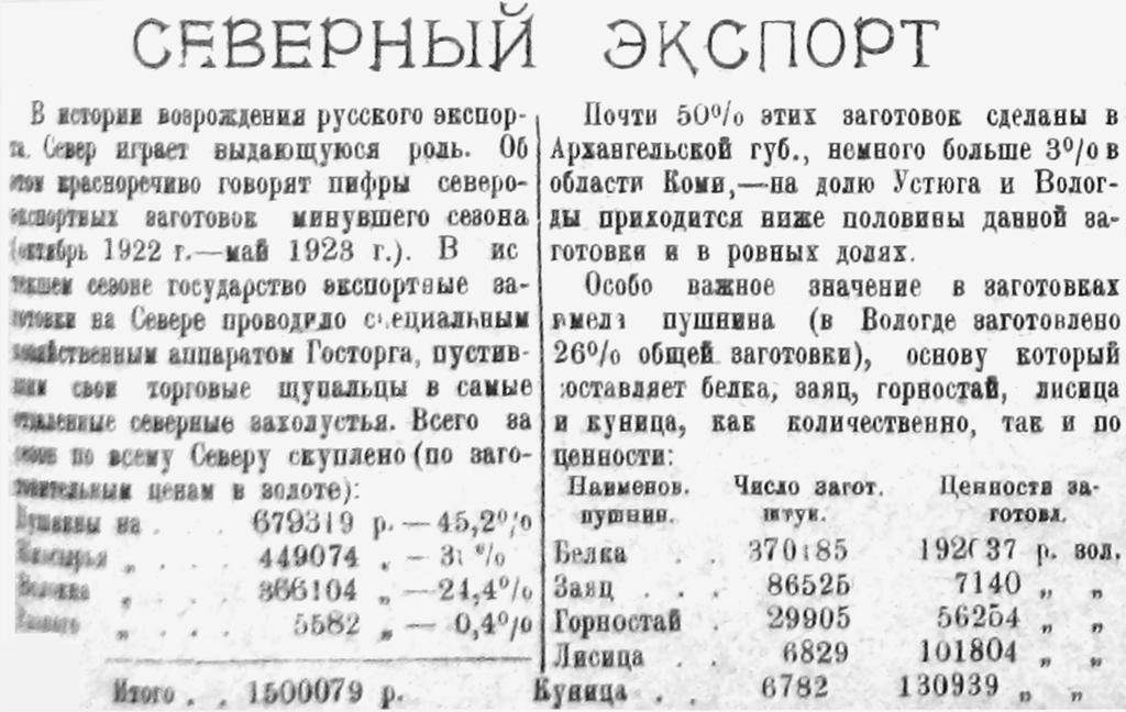В истории возрождения русского экспорта Север играет выдающуюся роль. Об этом красноречиво говорят цифры северо-экспортных заготовок минувшего сезона (октябрь 1922 г. — май 1923 г.). В истекшем сезоне государство экспортные заготовки на Севере проводило специальным хозяйственным аппаратом Госторга, пустившим свои торговые щупальцы в самые отдаленные северные захолустья. Всего за сезон по всему Северу скуплено (по заготовительным ценам в золоте):