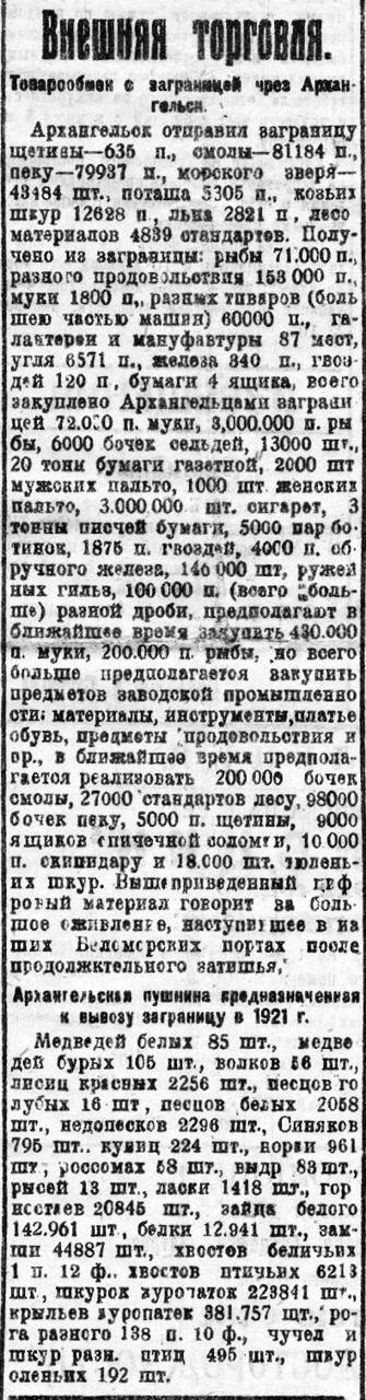 Архангельск отправил заграницу щетины—635 п., смолы—81184 п., пеку—79937 п., морского зверя—43484 шт., поташа 5305 п., козьих шкур 12628 п, льва 2821 п, лесоматериалов 4839 стандартов. Получено из заграницы: рыбы 71.000 п., разного продовольствия 158 000 п., муки 1800 п„ разных товаров (большею частью машин) 60000 п., галантереи и мануфактуры 87 мест, угля 6571 п., железа 840 п., гвоздей 120 п, бумаги 4 ящика, всего закуплено Архангельцами заграницей 72.000 п. муки, 3.000.000 п. рыбы, 6000 бочек сельдей, 13000 шт., 20 тонн бумаги газетной, 2000 шт. мужских пальто, 1000 шт. женских пальто, 3.000 000 шт. сигарет, 3 тонны писчей бумаги, 5000 пар ботинок, 1875 п. гвоздей, 4000 п. обручного железа, 146000 шт, ружейных гильз, 100 000 п. (всего больше) разной дроби, предполагают в ближайшее время закупить 430.000 п. муки, 200.000 п. рыбы, но всего больше предполагается закупить предметов заводской промышленности, материалы, инструменты, платье, обувь, предметы продовольствия и пр., в ближайшее время предполагается реализовать 200 000 бочек смолы, 27000 стандартов лесу, 98000 бочек пеку, 5000 п. щетины, 9000 ящиков спичечной соломки, 10.000 п. скипидару и 18.000 шт. тюленьих шкур. Вышеприведенный цифровой материал говорит за большое оживление, наступившее в наших Беломорских портах после продолжительного затишья.