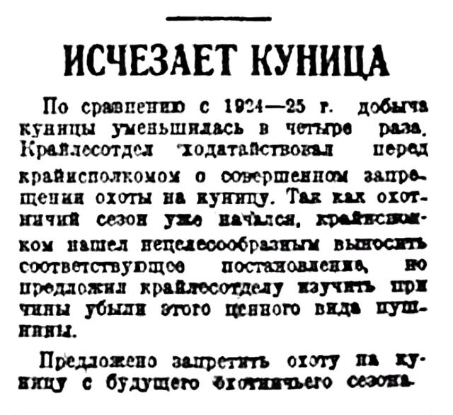По сравнению с 1924—25 г добыча куницы уменьшилась в четыре раза. Крайлесотдел ходатайствовал перед крайисполкомом о совершенном запрещении охоты на куницу. Так как охотничий сезон уже начался, крайисполком нашел нецелесообразным выносить соответствующее постановление, но предложил крайлесотделу изучить причины убыли этого ценного вида пушнины.