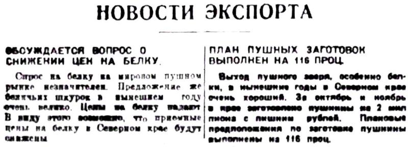 Спрос на белку на мировом пушном рынке незначителен. Предложение же беличьих шкурок в нынешнем году очень велико. Цены на белку падают. В виду этого возможно, что приемные цены на белку в Северном крае будут снижены.