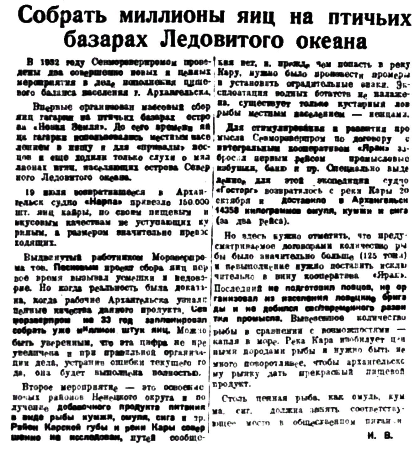 Выдвинутый работником Морзверпрома тов. Песковым проект сбора яиц первое время вызывал усмешки и недоверие. Но когда реальность была доказана, когда рабочие Архангельска узнали ценные качества данного продукта, Севморзверпром на 33 год запланировал собрать уже миллион штук яиц. Можно быть уверенным, что эта цифра не преувеличена и при правильной организации дела, устранив ошибки текущего года, она будет выполнена полностью.