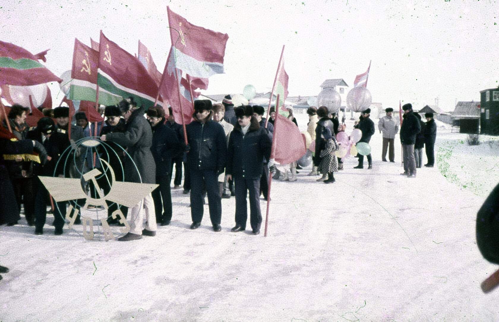 Колонна ЧОАЭ на первомайском празднике на фоне старого здания аэровокзала и вышки пожарной части. В хвосте колонны работники АМСГ со своими специфическими шариками. Из архива Елены Шпилькиной "Одноклассники"