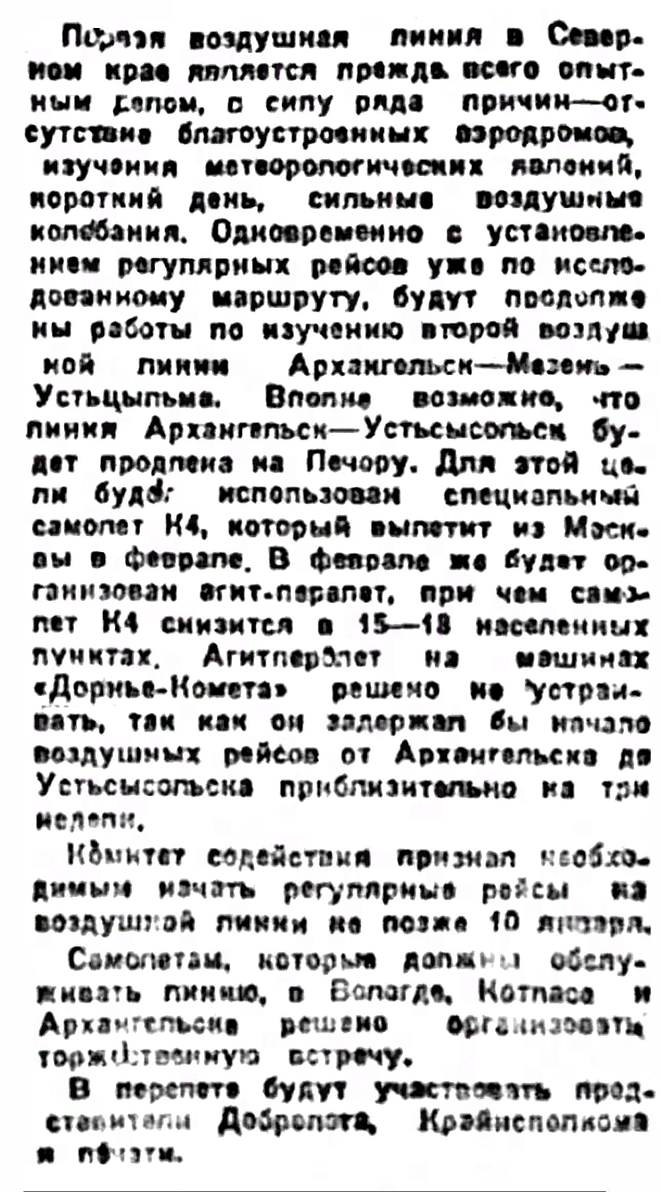 Первая воздушная пиния в Северном крае является прежде всего опытным делом, в силу ряда причин — отсутствия благоустроенных аэродромов, изучения метеорологических явлений, короткий день, сильные воздушные колебания. Одновременно с установлением регулярных рейсов уже по исследованному маршруту, будут продолжены работы по изучению второй воздушной линии Архангельск — Мезень — Устьцыльма. Вполне возможно, что линия Архангельск — Устьсысольск будет продлена на Печору. Для этой цели будет использован специальный самолет К4, который вылетит из Москвы в феврале. В феврале же будет организован агит-перелет, при чем самолет К4 снизится в 15—18 населенных пунктах. Агитперелет на машинах «Дорнье-Комета» решено не устраивать, так как он задержал бы начало воздушных рейсов от Архангельска до Устьсысольска приблизительно на три недели.