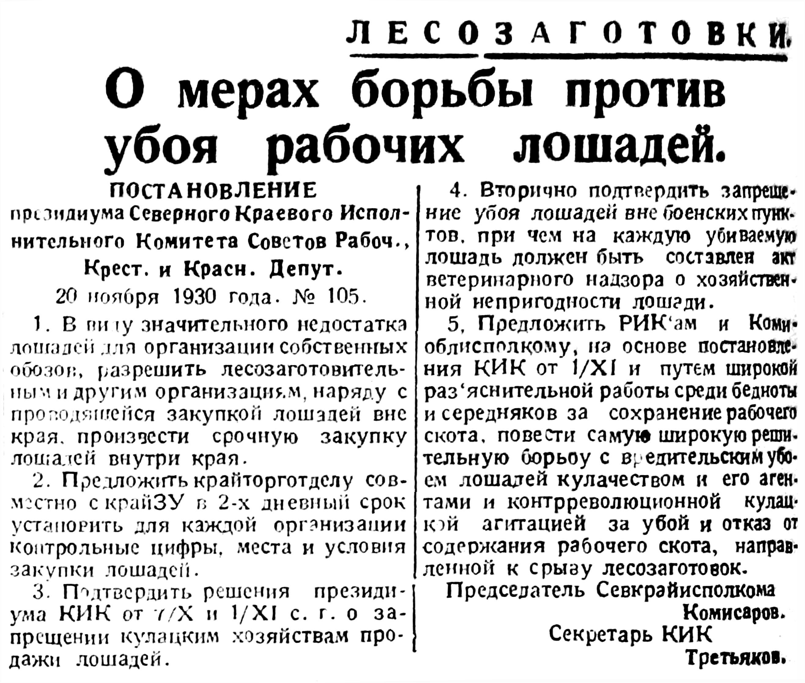 5. Предложить РИК'ам и Комиоблисполкому, на основе постановления КИК от 1/XI и путем широкой разъяснительной работы среди бедноты и середняков за сохранение рабочего скота, повести самую широкую решительную борьбу с вредительским убоем лошадей кулачеством и его агентами и контрреволюционной кулацкой агитацией за убой и отказ от содержания рабочего скота, направленной к срыву лесозаготовок.