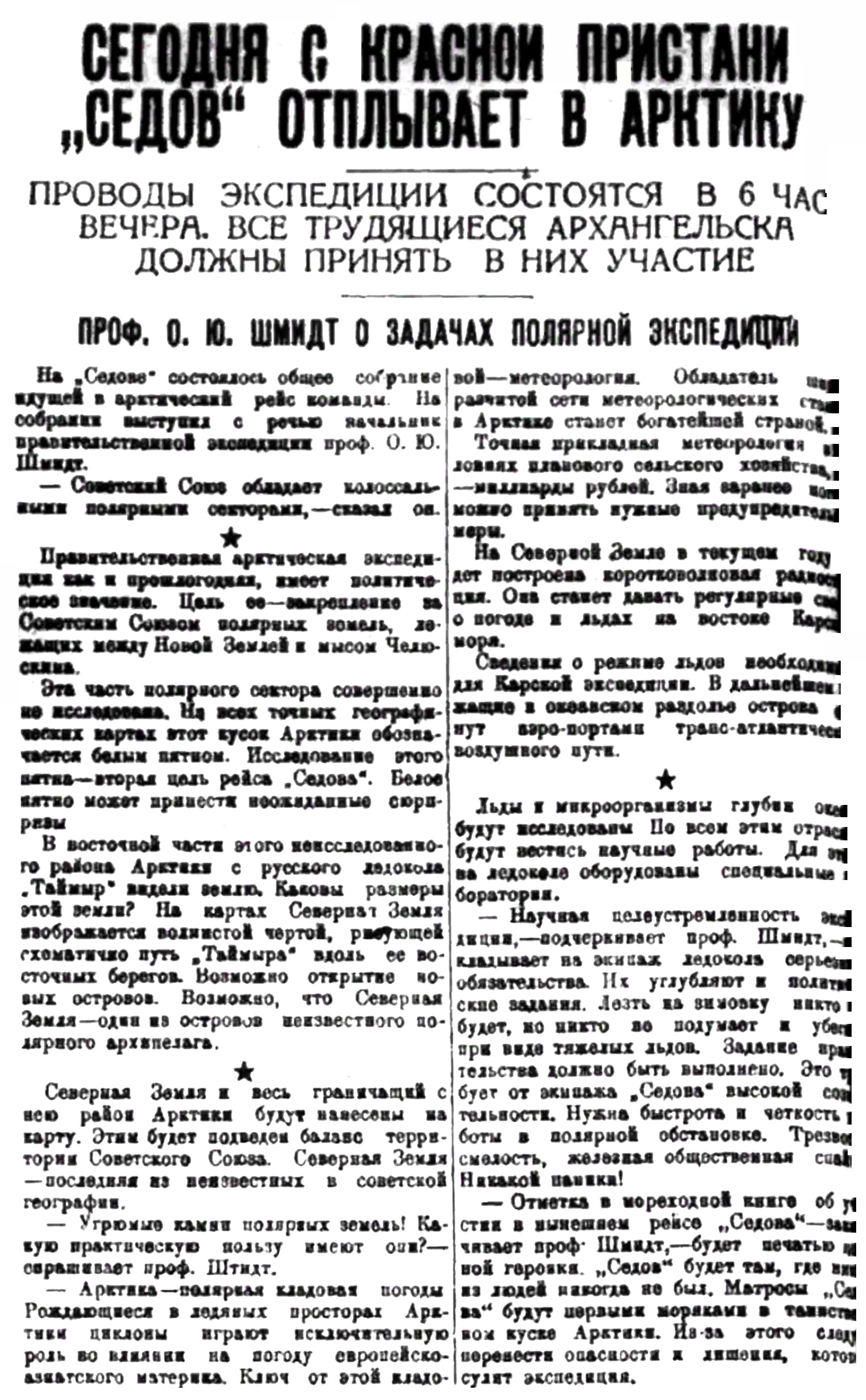 — Трудами первой арктической экспедиции к Советскому Союзу присоединена земля Франца Иосифа. Экспедиция этого года должна водрузить знамя Страны Советов на Северной Земле. Эта экспедиция, как и все советские экспедиции, в отличие от буржуазных не носит только научно-исследовательского характера, она теснейшим образом увязана с выполнением нашей пятилетия со строительством Нового Севера.