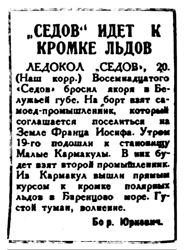 В №№109 и 112 "Правды Севера" имеются конкретные указания на то, что состоится экспедиция на Землю Франца Иосифа. Были даже в Архангельске представители экспедиции. Они заходили в Совторгфлот и интересовались: какой ледокол пойдет, кто капитан и как снабжается экспедиция. Это делалось в пределах милых бесед, без каких либо реальных указаний. Поговорили и уехали.