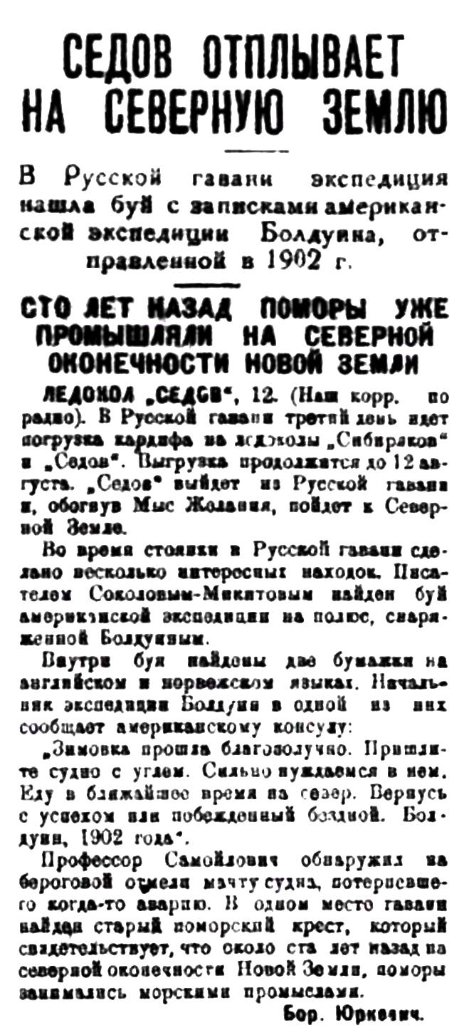Во время стоянки в Русской гавани сделано несколько интересных находок. Писателем Соколовым-Микитовым найден буй американской экспедиции на полюс, снаряженной Болдуином.