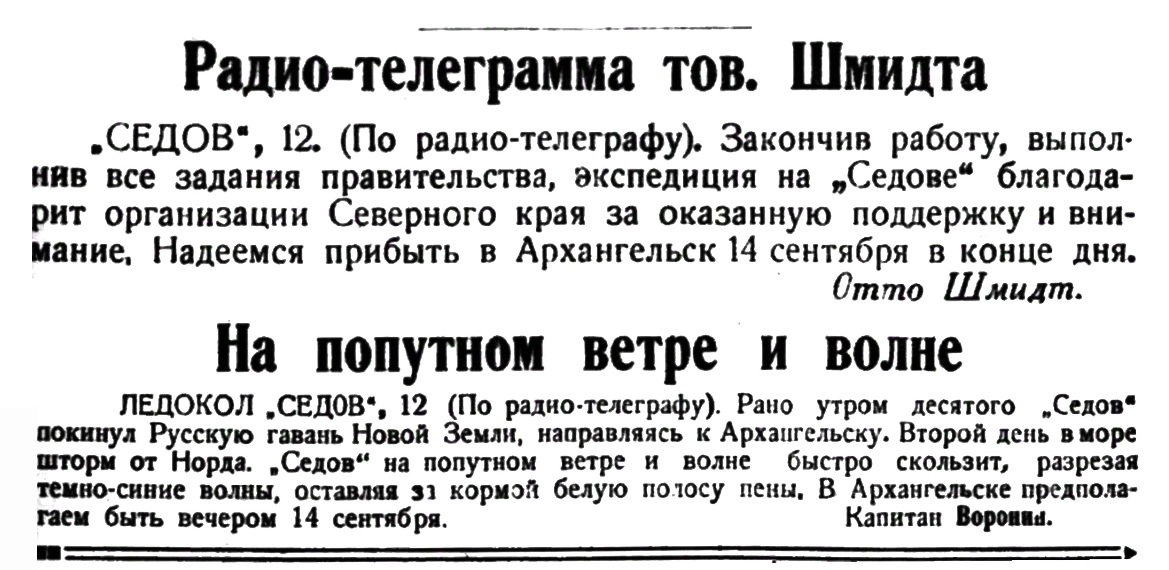 "СЕДОВ", 12. (По радио-телеграфу). Закончив работу, выполняв все задания правительства, экспедиция на "Седове" благодарит организации Северного края за оказанную поддержку и внимание. Надеемся прибыть в Архангельск 14 сентября в конце дня.