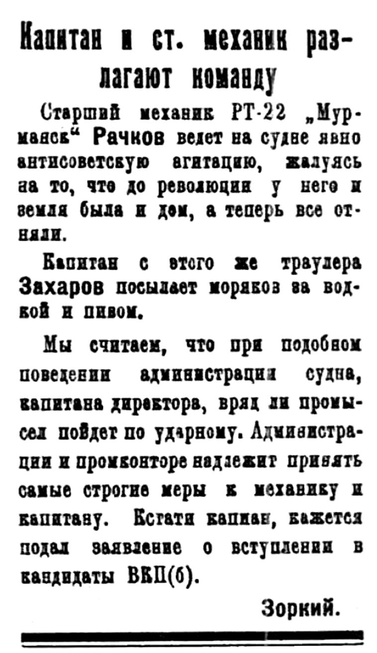 Мы считаем, что при подобном поведении администрации судна, капитана директора, вряд ли промысел пойдет по ударному. Администрации и промконторе надлежит принять самые строгие меры к механику и капитану. Кстати капитан, кажется подал заявление о вступлении в кандидаты ВКП(б).