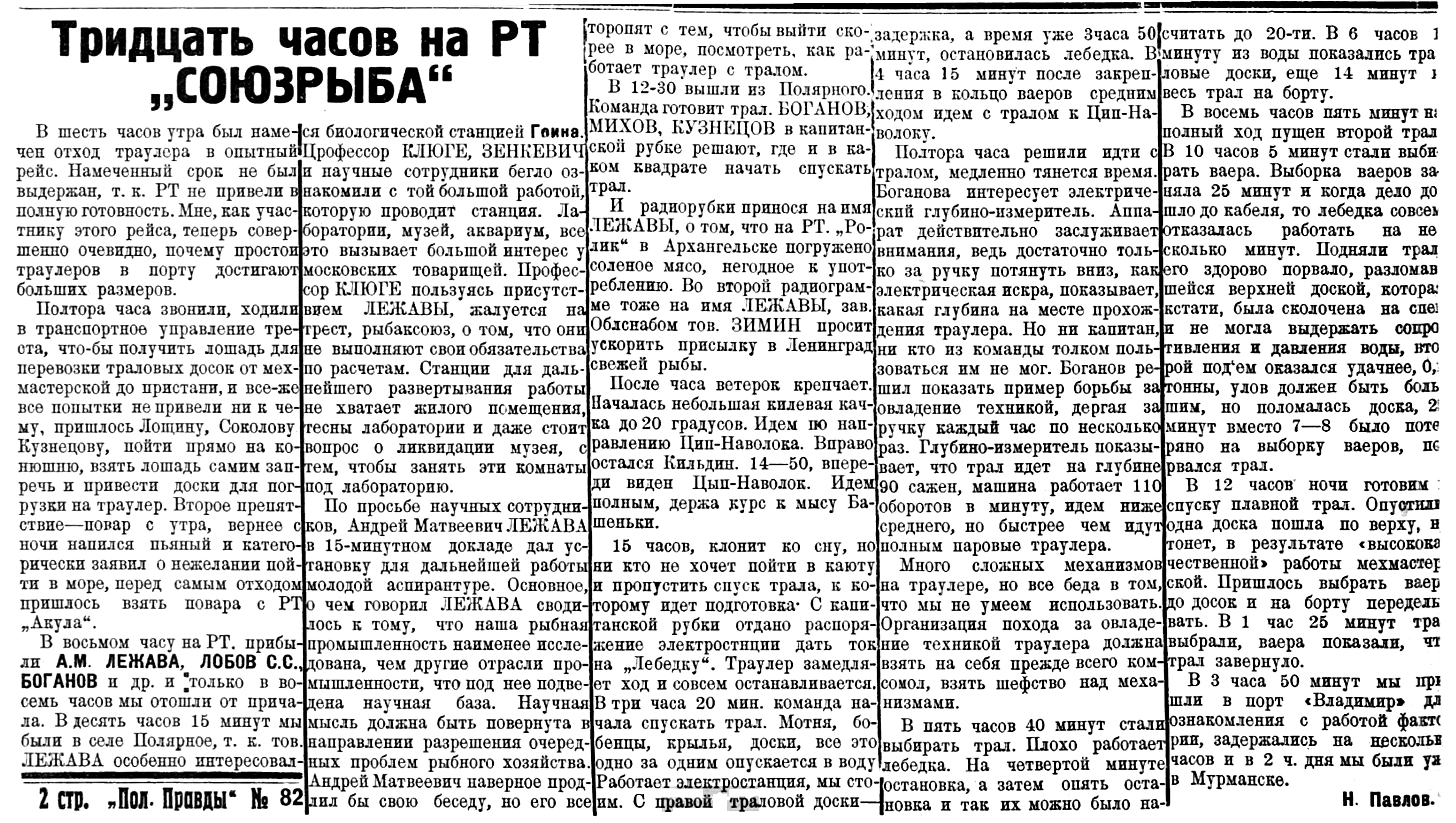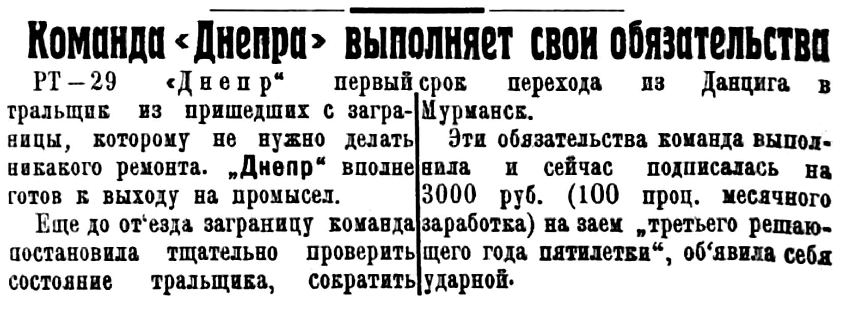 Управление Промфлота просит через газету оповестить членов семьи команд РТ, что все РТ находятся на промысле, либо в порту на базе. В частности, РТ— "Тралмейстер" сообщает: "ввиду ограниченности угля кончаем лов" — телеграмма от 25/I-31 г. В момент, когда слух о якобы гибели РТ "Макрель" был распространен, она разгружалась на базе и заведена в док для ремонта.