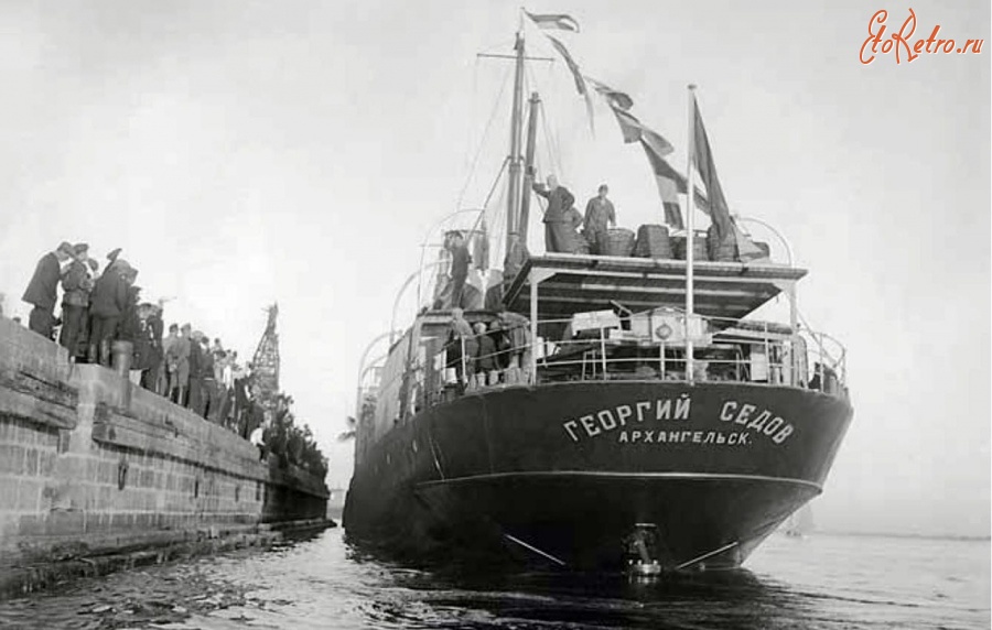 А на набережной В. И. Ленина “Георгия Седова” ожидают тысячи архангелогородцев. Вот он разворачивается и подходит к Красной пристани. На мостике ледокольного парохода сверкает изображение ордена Ленина. Гремят духовые оркестры. <…> Архангельская студия телевидения впервые ведет передачу непосредственно с места события.