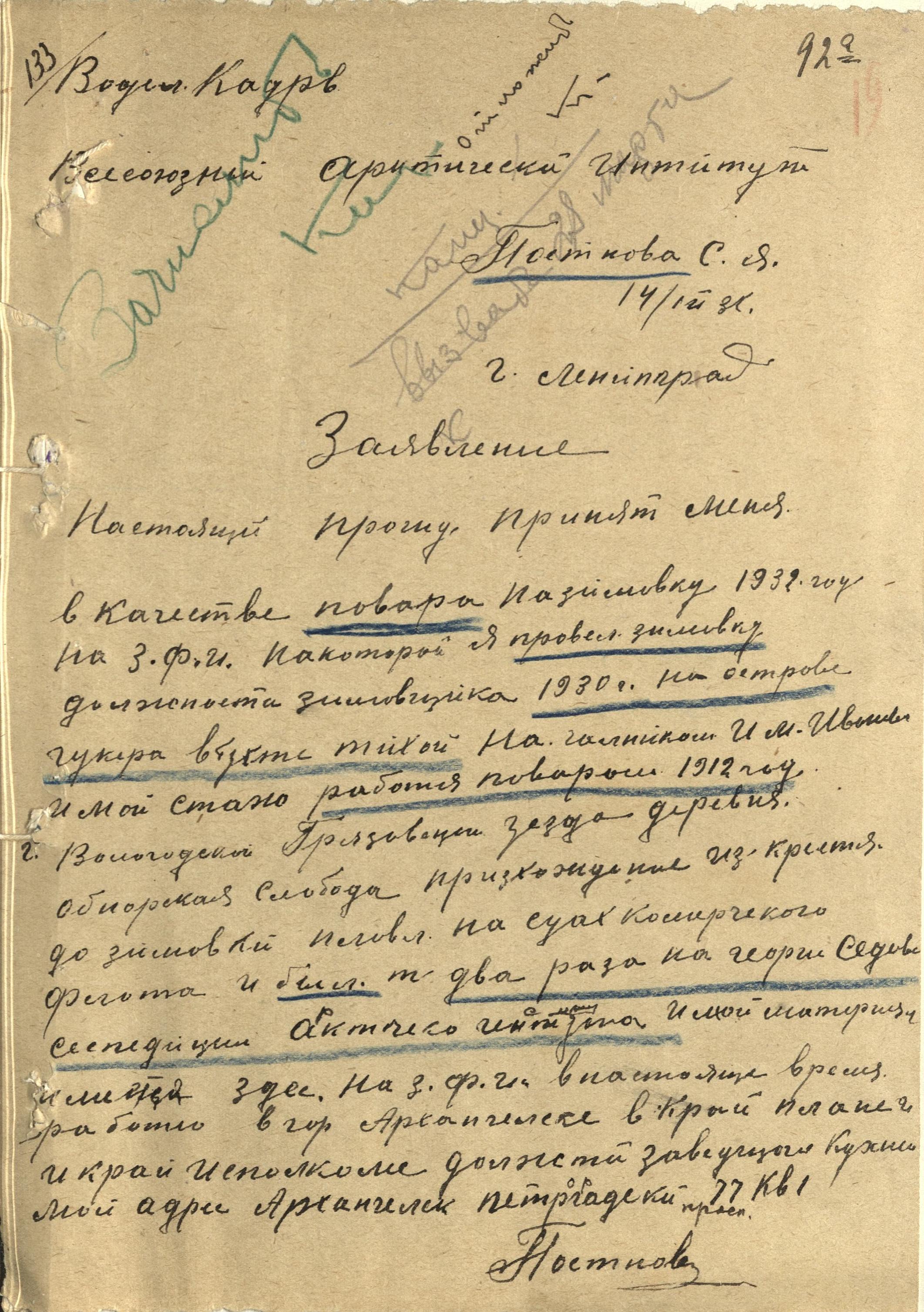 Любопытный документ. Письмо С.Постнова, который зимовал в 1930-31, с просьбой взять его в новую экспедицию. ЦГАНТД СПБ_ Ф.Р.-369. Оп.1-1. Д.62. Л. 19