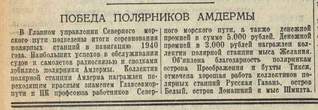В этом году радио и гидрометстанция Амдермы приняли участие в обеспечении беспосадочного перелета В.П. Чкалова, Г.П. Байдукова и А.Ф. Белякова по маршруту Москва-Арктика-Камчатка.