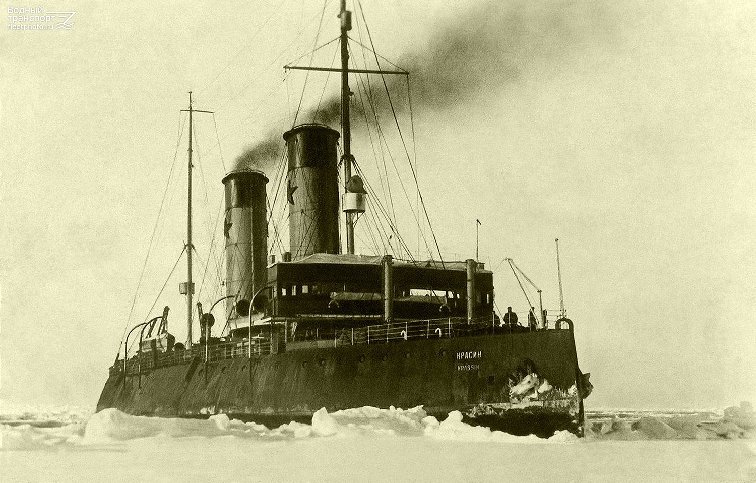 "Красин* в настоящее время является самым мощным ледоколом в мире. По своим размерам,другим данным и чертежу, он является прямым и улучшенным потомком первого нашего крупного ледокола „Ермака*, построенного в 1899 г. испытанного в полярных льдах (доходил до 82° сев. шир.) и усовершенствованного в соответствии с результатами этого опыта.