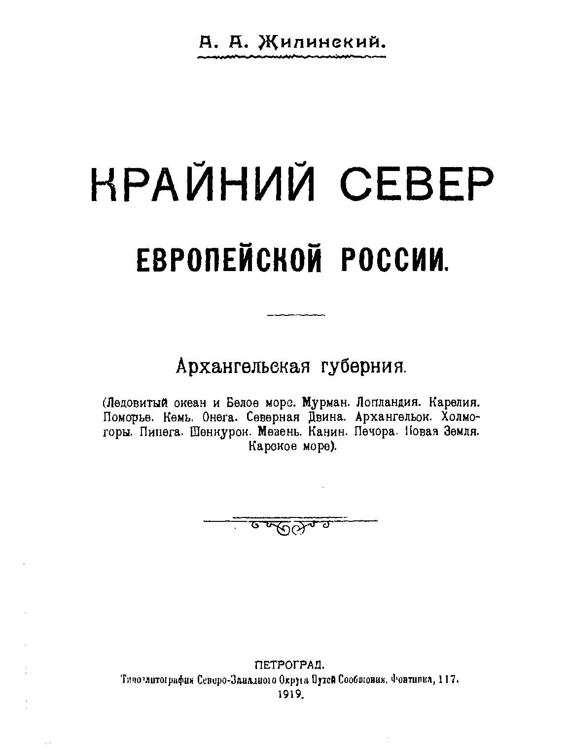 Жилинский А. А. Крайний Север Европейской России : Архангельская губерния (Ледовый океан и Белое море. Мурман. Лапландия. Карелия. Поморье. Кемь. Онега. Северная Двина. Архангельск. Холмогоры. Пинега. Шенкурск. Мезень. Канин. Печора. Новая Земля. Карское море)/ А. А. Жилинский ; авт. предисл. С. Л. Маневич. - Петроград : Ред. кол. спец. техн. и экон. изд. Нар. ком. путей сообщ., 1919. - [2], 2, 296 с.