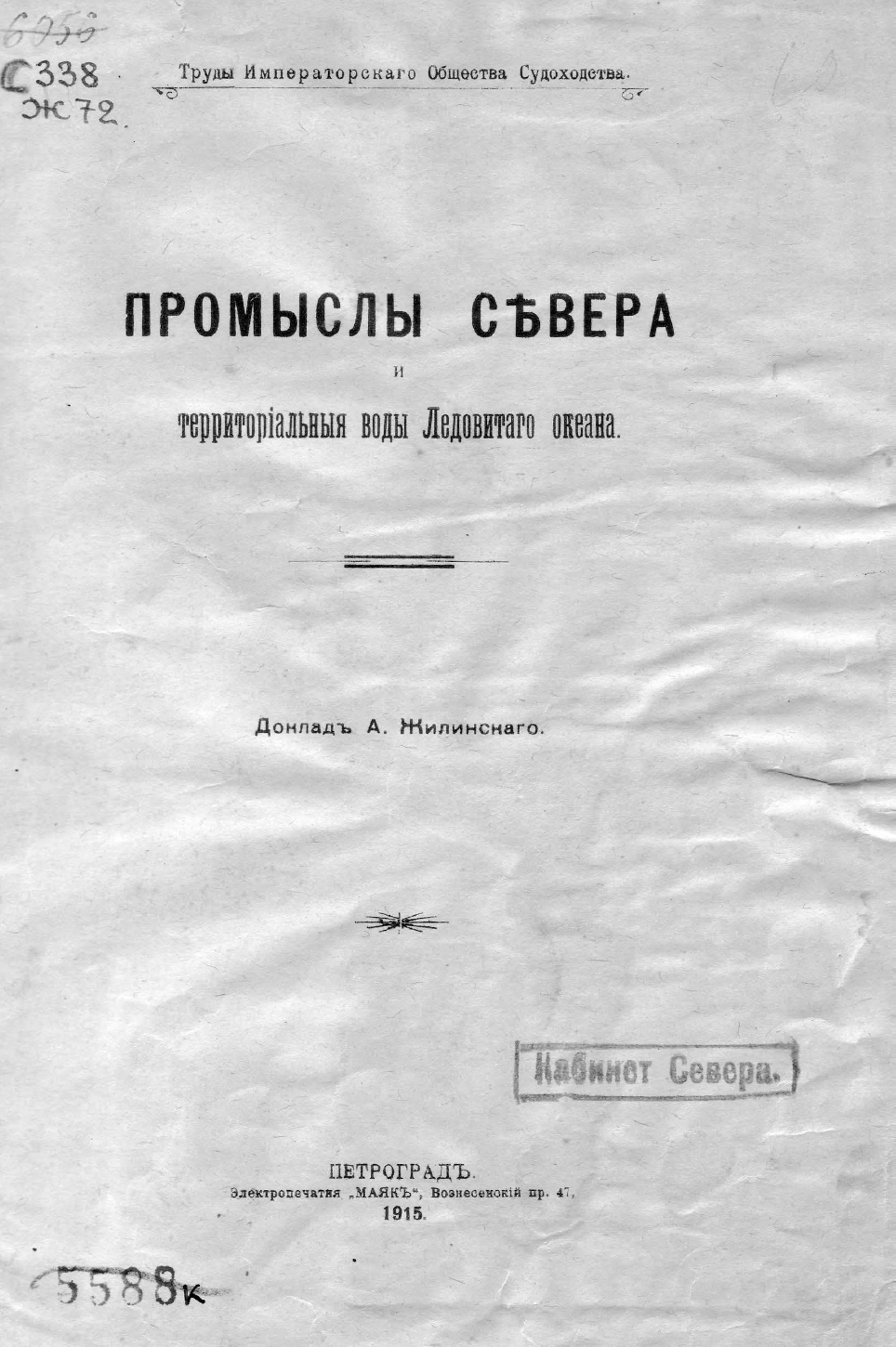 Жилинский, А. А. Промыслы Севера и территориальные воды Ледовитого океана : Доклад / А. Жилинского. - Пг. : Электропечатня "Маяк", 1915. - 17 с.