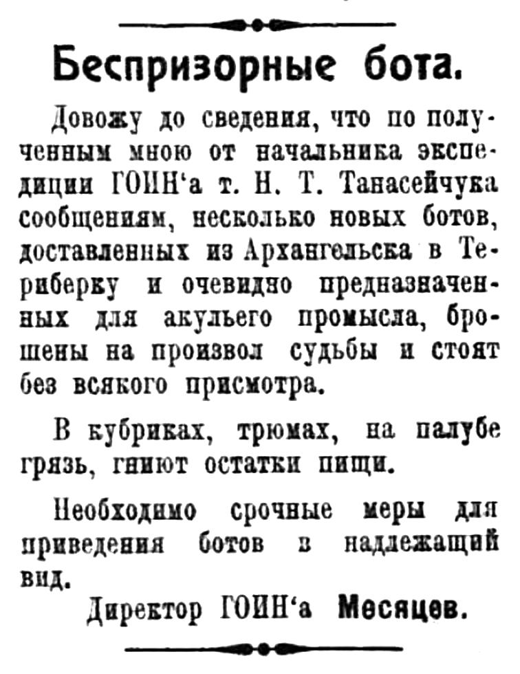 Довожу до сведения, что но полученным мною от начальника экспедиции ГОИН'а т. Н. Т. Танасейчука сообщениям, несколько новых ботов, доставленных из Архангельска в Териберку и очевидно предназначенных для акульего промысла, брошены на произвол судьбы и стоят без всякого присмотра.