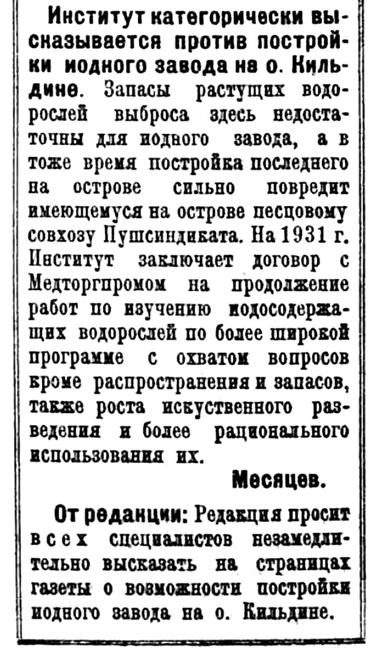 Институт категорически высказывается против постройки иодного завода на о. Кильдине. Запасы растущих водорослей выброса здесь недостаточны для иодного завода, а в тоже время постройка последнего на острове сильно повредит имеющемуся на острове песцовому совхозу Пушсиндиката. На 1931 г. Институт заключает договор с Медторгпромом на продолжение работ по изучению иодосодержащих водорослей по более широкой программе с охватом вопросов кроме распространения и запасов, также роста искусственного разведения и более рационального использования их.