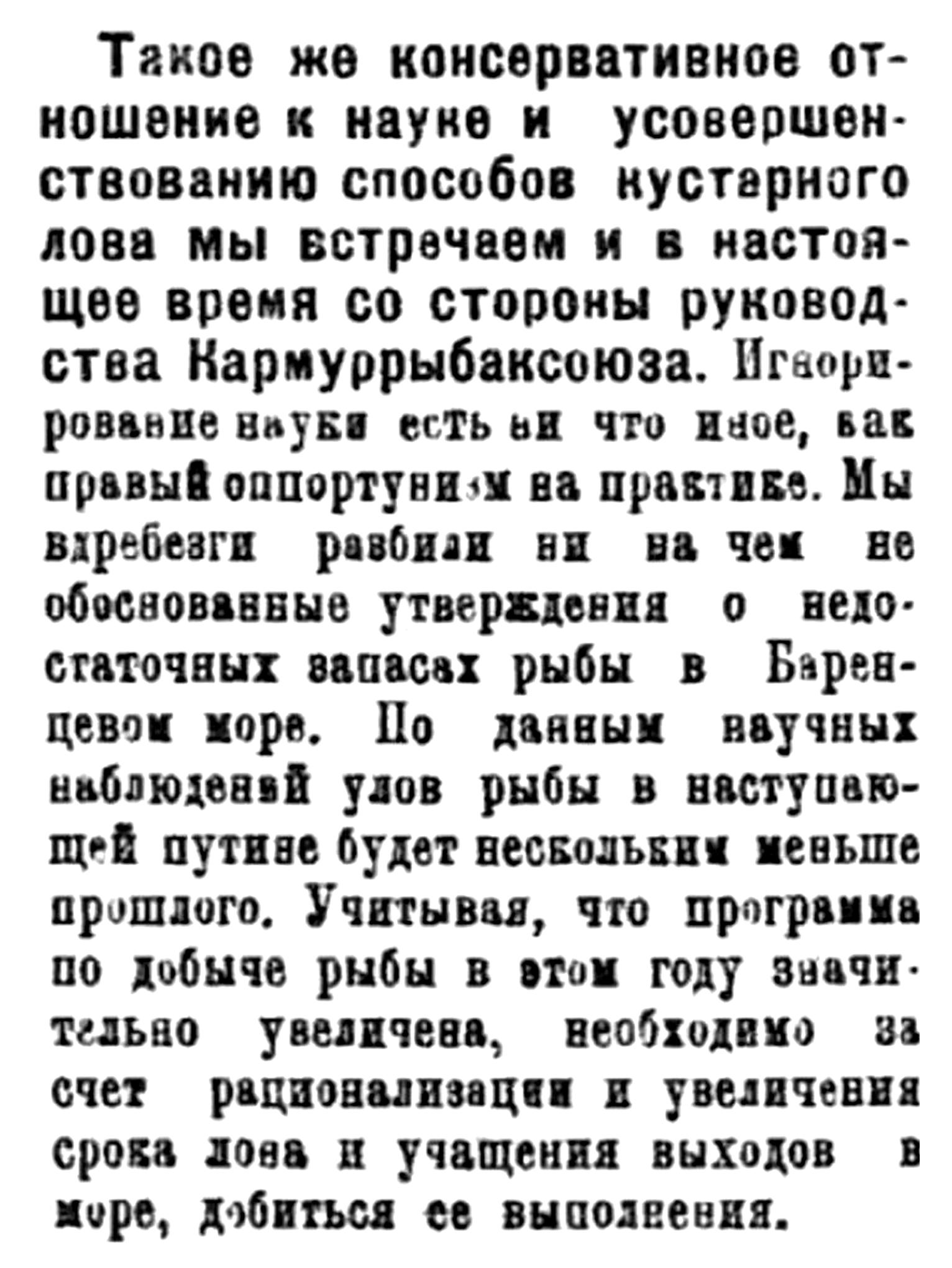 Такое же консервативное отношение к науке и усовершенствованию способов кустарного лова мы встречаем и в настоящее время со стороны руководства Кармуррыбаксоюза. Игнорирование науки есть ни что иное, как правый оппортунизм на практике. Мы вдребезги разбили ни на чем не обоснованные утверждения о недостаточных запасах рыбы в Баренцевом море. По данным научных наблюдений улов рыбы в наступающей путине будет нескольким меньше прошлого. Учитывая, что программа по добыче рыбы в этом году значительно увеличена, необходимо за счет рационализации и увеличения срока лова и учащения выходов в море, добиться ее выполнения.