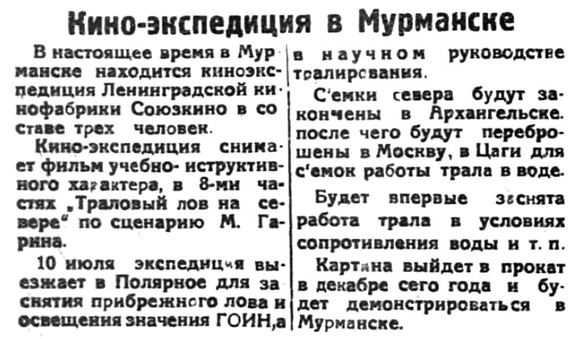 В настоящее время в Мурманске находится киноэкспедиция Ленинградской кинофабрики Союзкино в составе трех человек.