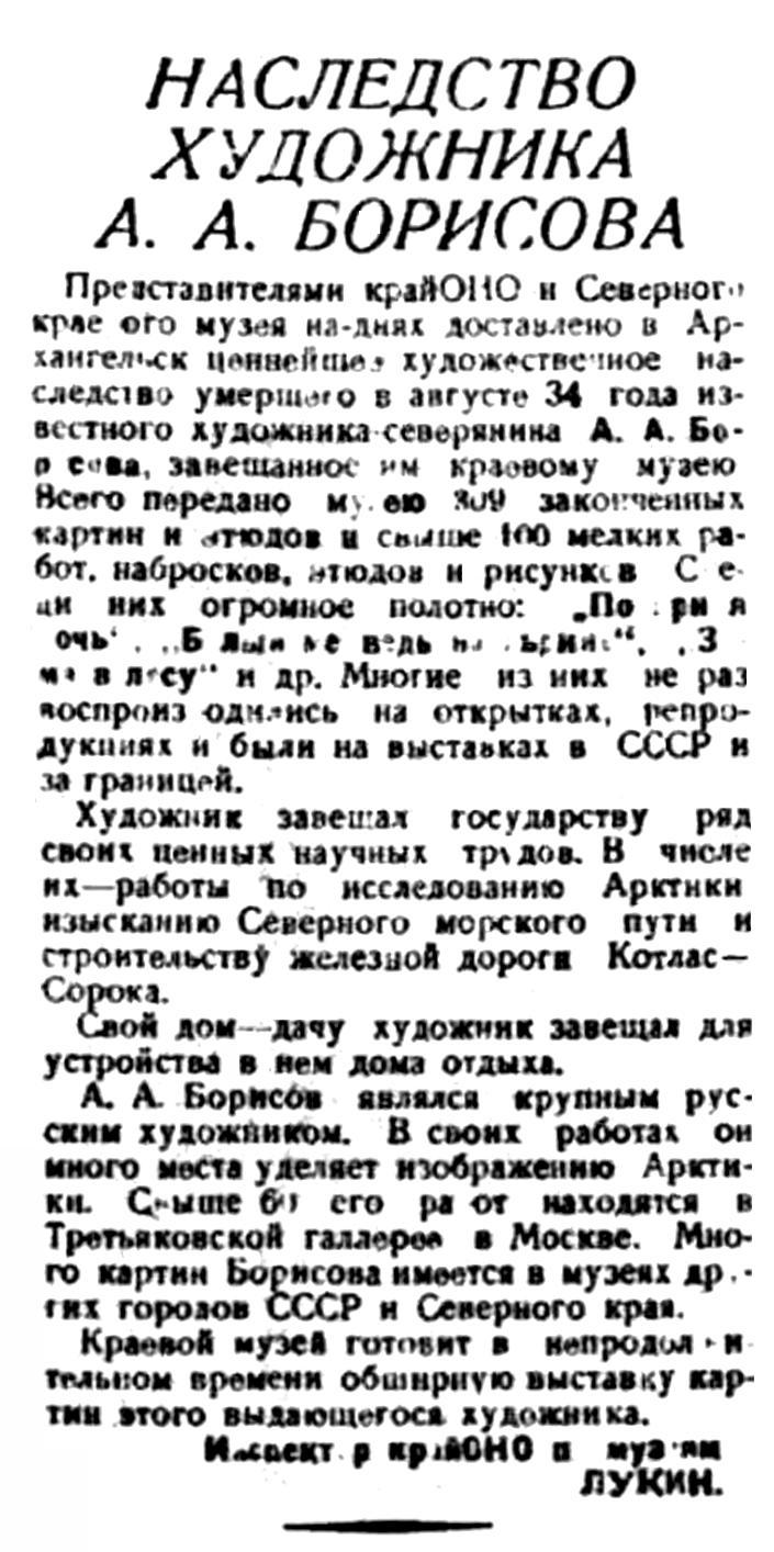 Представителями крайОНО и Северного краевого музея на-днях доставлено в Архангельск ценнейшее художественное наследство умершего в августе 34 года известного художника-северянина А. А. Борисова, завещанное им краевому музею. Всего передано музею 309 законченных картин и этюдов и свыше 100 мелких работ, набросков, этюдов и рисунков. Среди них огромное полотно: "Полярная ночь", "Белый медведь на льдине", "Зима в лесу" и др. Многие из них не раз воспроизводились на открытках, репродукциях и были на выставках в СССР и за границей.