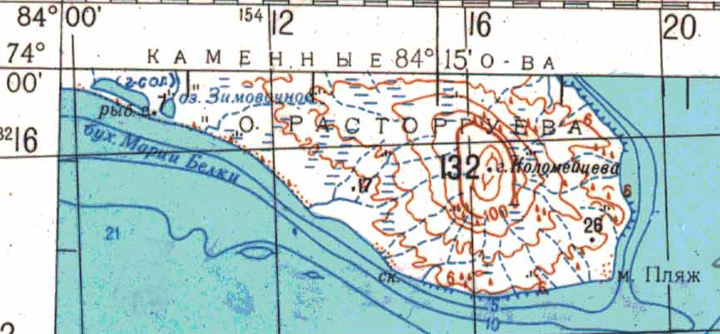 И вот наступает весна 1933 года. Я — начальник экспедиции, вышел на судах Енисейского отряда. Приходим на Диксон, и первой операцией была высадка астронома (моего друга С. Н. Кравкова, 1894–1942) на о. Расторгуева. Подходим к острову, он окружен непроходимым льдом. С трудом высадили Кравкова на западный край острова, он — двухвершинный, зимовка (в данное время пустая) близ берега бухты на южном берегу острова. Высадили астропартию (2 человека) с трудом, с минимальным запасом продуктов, но я предупредил Кравкова, что, если мы задержимся, придем за ним к о. Расторгуева не скоро, то он сможет пройти к опустевшей зимовке и взять там сколько нужно, ведь на опустевшей зимовке остался двухгодичный запас продовольствия на четверых. И пришлось нам задержаться по разным обстоятельствам. Подходим к острову только недели через две, льда у острова совсем нет, море чисто. Подошли мы к южному берегу западной части острова, спустили шлюпку, взяли группу Кравкова. Он успел сообщить мне, что ходил на зимовку, зашел, между прочим, в комнату, где жила семья М.К.Б., там не прибрано, заглянул в шкатулочку на „туалете“ М.К.Б., она полна драгоценностей (кольца, серьги и т. д.). Там же на столе среди разных бумаг лежала как бы памятная запись М.К.Б., в которой она кратко отмечала даты, когда и кто ушел на промысел (муж или Н.), что принес и т. д. Просмотрел я эту принесенную Кравковым запись, видно, что муж М.К.Б. ходил на промысел весь сезон, последняя запись поздней весной — отметки о приходе мужа нет.