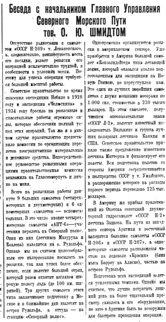 Беседа с нач.ГУСМП тов.О.Ю.Шмидтом//Полярная правда 22 августа № 193 1937