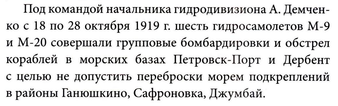 Под командой начальника гидродивизиона А. Демченко с 18 по 28 октября 1919 г. шесть гидросамолетов М-9 и М-20 совершали групповые бомбардировки и обстрел кораблей в морских базах Петровск-Порт и Дербент с целью не допустить переброски морем подкреплений в районы Ганюшкино, Сафроновка, Джумбай.