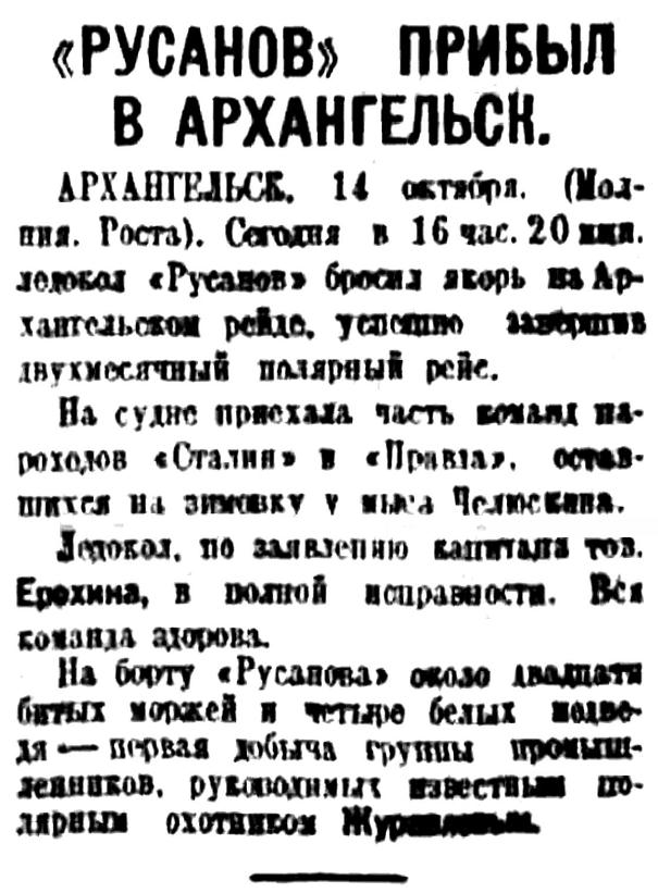 После двухмесячного полярного похода 14 октября ледокольный пароход "Русанов" вернулся в Архангельск. Основное задание Восточно-Таймырской экспедиции по доставке в бухту Прончищева промысловой партии охотников, возглавляемой краснознаменцем Сергеем Журавлевым выполнено блестяще. Не только полностью выгружены продовольствие, снаряжение, топливо, собаки и доставлены промышленники с семьями, но и закончено строительство большого жилого дома и бани в новом осваиваемом пункте на далеком Севере.