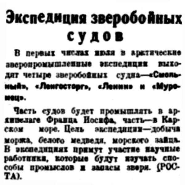 В первых числах июля в арктические зверопромышленные экспедиции выходят четыре зверобойных судна — "Смольный", "Ленгосторг", "Ленин[градсовет]" и "Муромец" ["Мурманец"].