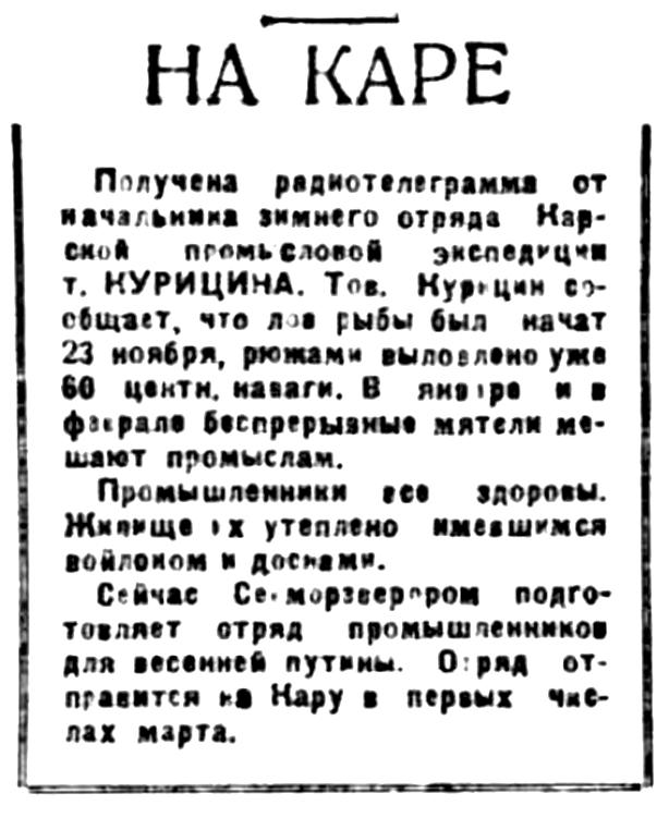 Получена радиотелеграмма от начальника зимнего отряда Карской промысловой экспедиции т. КУРИЦИНА. Тов. Курицин сообщает, что лов рыбы был начат 23 ноября, рюжами выловлено уже 60 центн. наваги. В январе и в феврале беспрерывные мятели мешают промыслам.