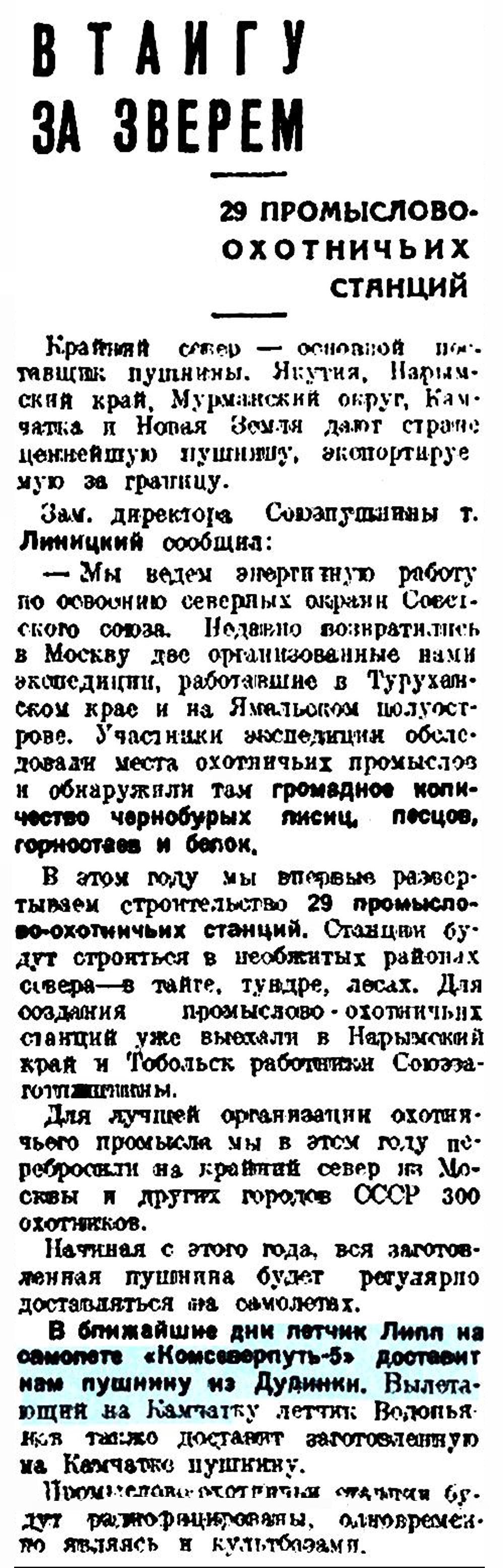 В ближайшие дни летчик Липп на самолете «Комсеверпутъ-5» доставит нам пушнину из Дудинки. Вылетающий на Камчатку летчик Водопьянов также доставит заготовленную на Камчатке пушнину.