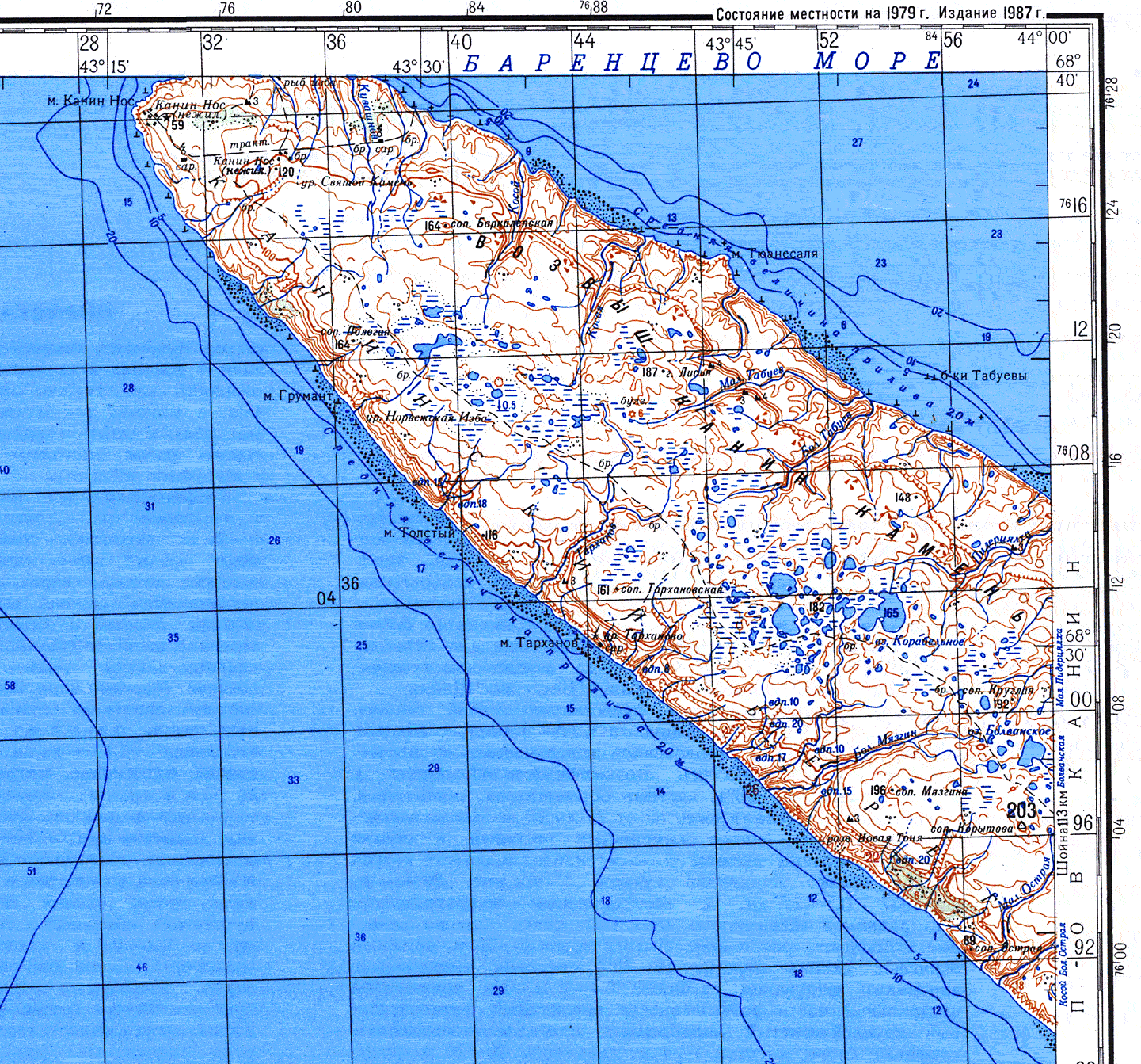 Плавали поморы, придерживаясь берега, определяясь по береговым приметам, сохраняя в памяти и рукописных книгах сведения, добытые личным опытом и из рассказов других. На Канинском берегу, как и в других местах Белого моря, для лучшей ориентировки устанавливали гурии и кресты (см. очерк "Абрамовский"). И все же даже в начале нынешнего века "Лоция Белого моря" рекомендовала огибать мыс Канин Нос не ближе 5 миль, а в туман - на расстоянии около 20 миль и все время бросать лот. И лишь убедившись, что Канин Нос пройден, можно было прибавить ход.