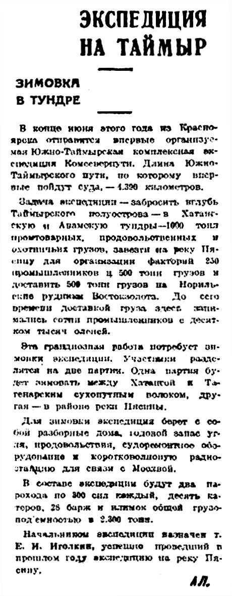 Начальником экспедиции назначен т. Е. И. Иголкин, успешно проведший в прошлом году экспедицию на реку Пясину.